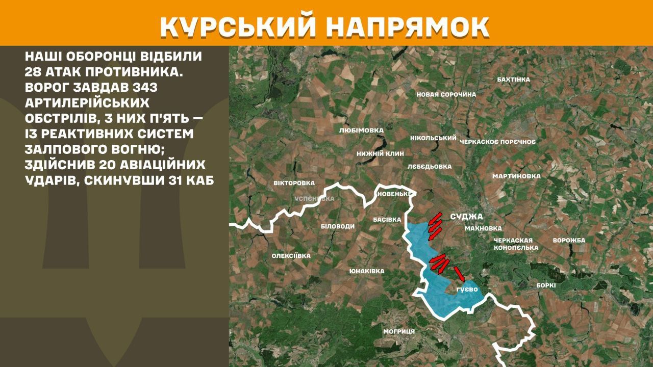 На Курском – наши воины отбили 28 атак врага. Оккупанты нанесли 343 артиллерийских обстрела, из них 5 – из реактивных систем залпового огня. Также осуществили 20 авиационных ударов, сбросив 31 КАБ.