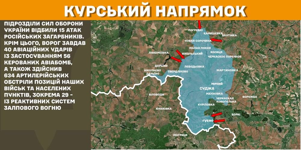 В операционной зоне в Курской области подразделения Сил обороны Украины вчера отбили 15 атак российских захватчиков. Кроме этого, враг нанес 40 авиационных ударов с применением 56 управляемых авиабомб, а также совершил 634 артиллерийских обстрела позиций наших войск и населенных пунктов, в том числе 29 – из реактивных систем залпового огня.