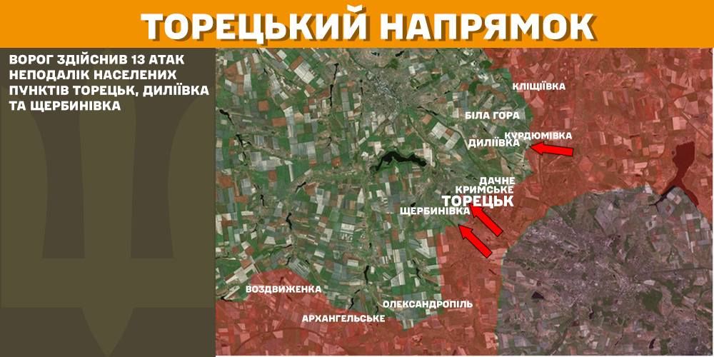 На Торецком направлении противник совершил 13 атак неподалеку населенных пунктов Торецк, Дилиевка и Щербиновка.