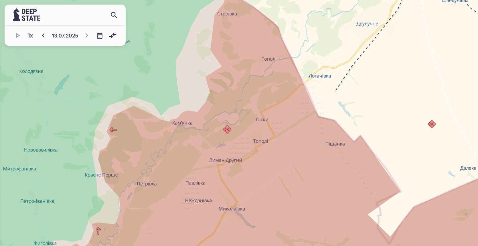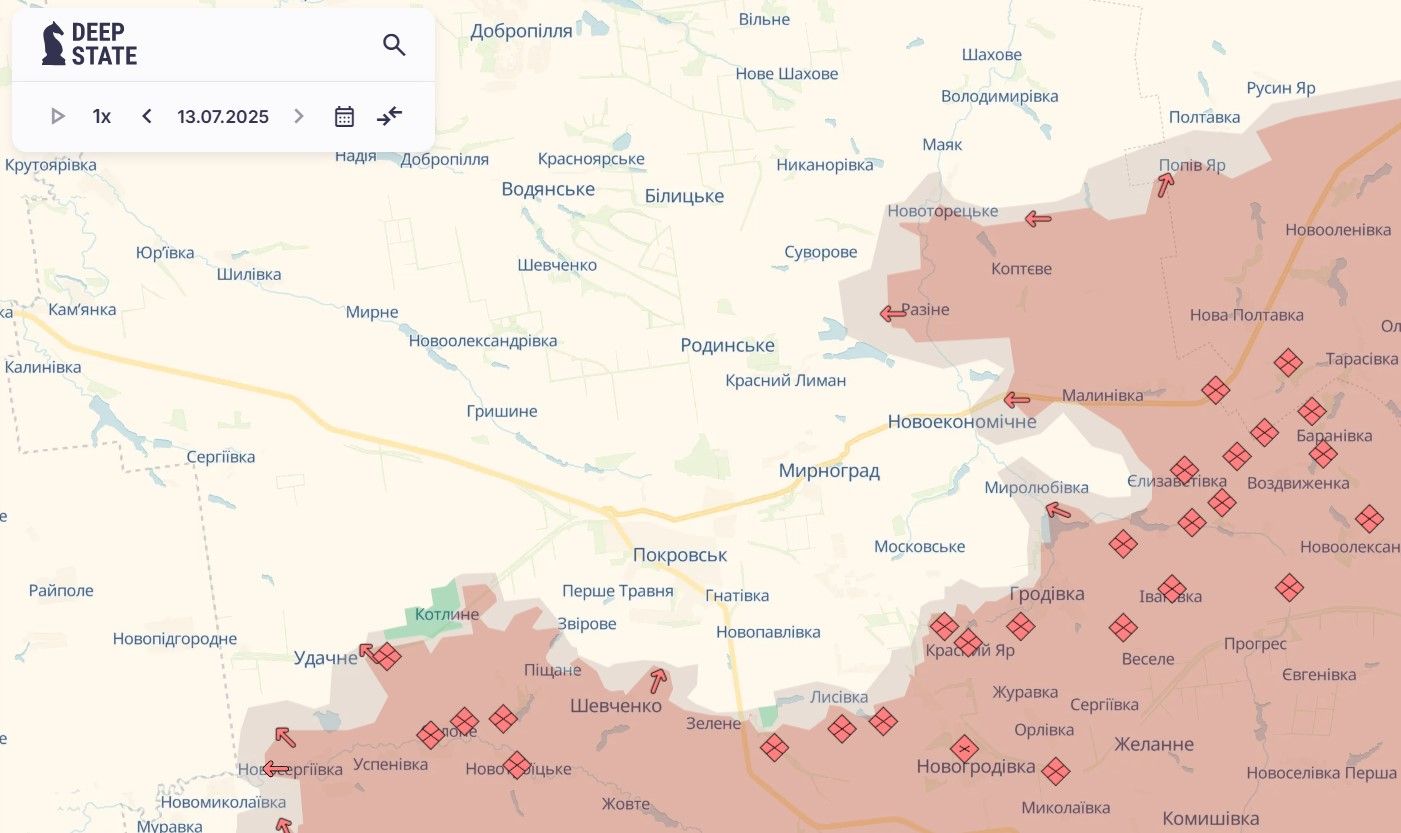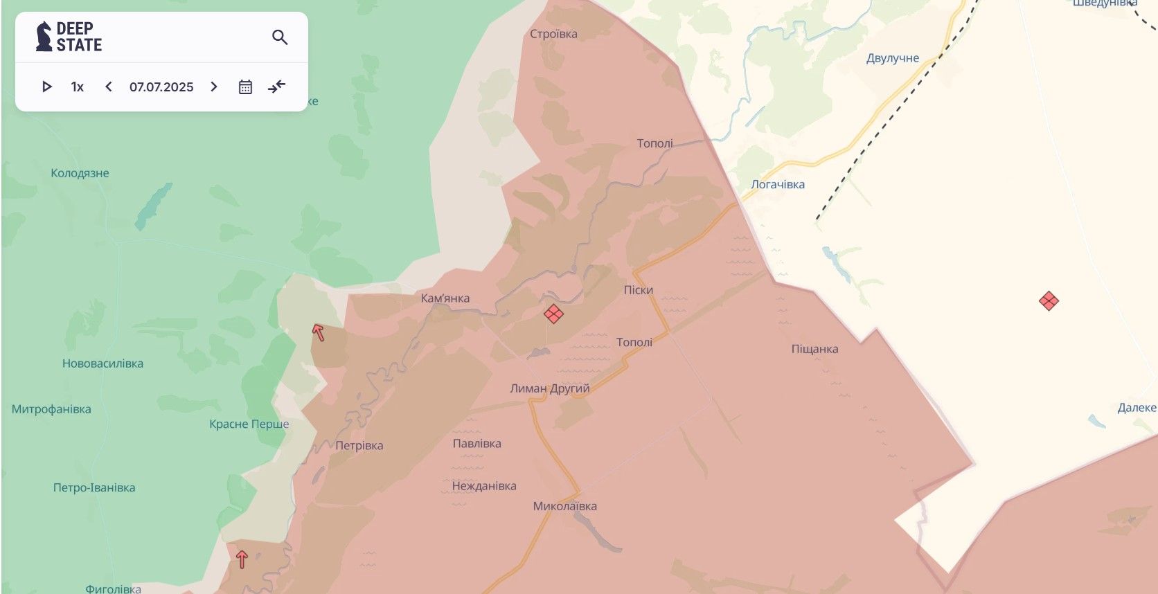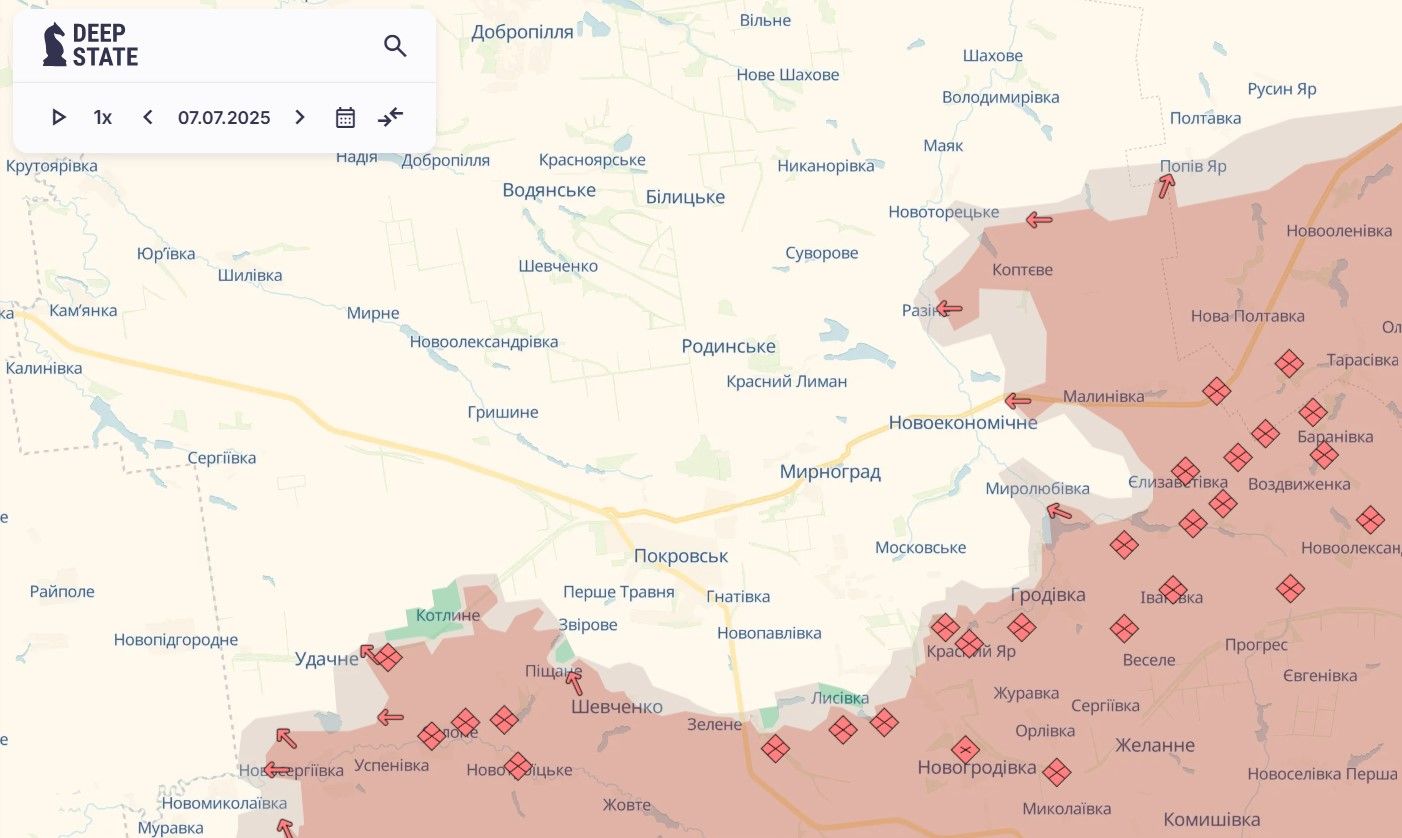 На прошлой неделе россияне оккупировали село Разино и прорвались в Новоторецкое, что на северо-востоке от Покровска. Оккупанты пытаются двигаться на запад в направлении Днепропетровской области. Однако активность россиян на этом участке создает угрозы не только для Покровска и Мирнограда. На прошлой неделе из-за приближения линии фронта в Доброполье враг начал применять FPV-дроны для ударов по городу. Например, только за день 8 июля россияне применили 40 дронов для ударов по Доброполью. Также под постоянными атаками трасса Доброполье – Краматорск.