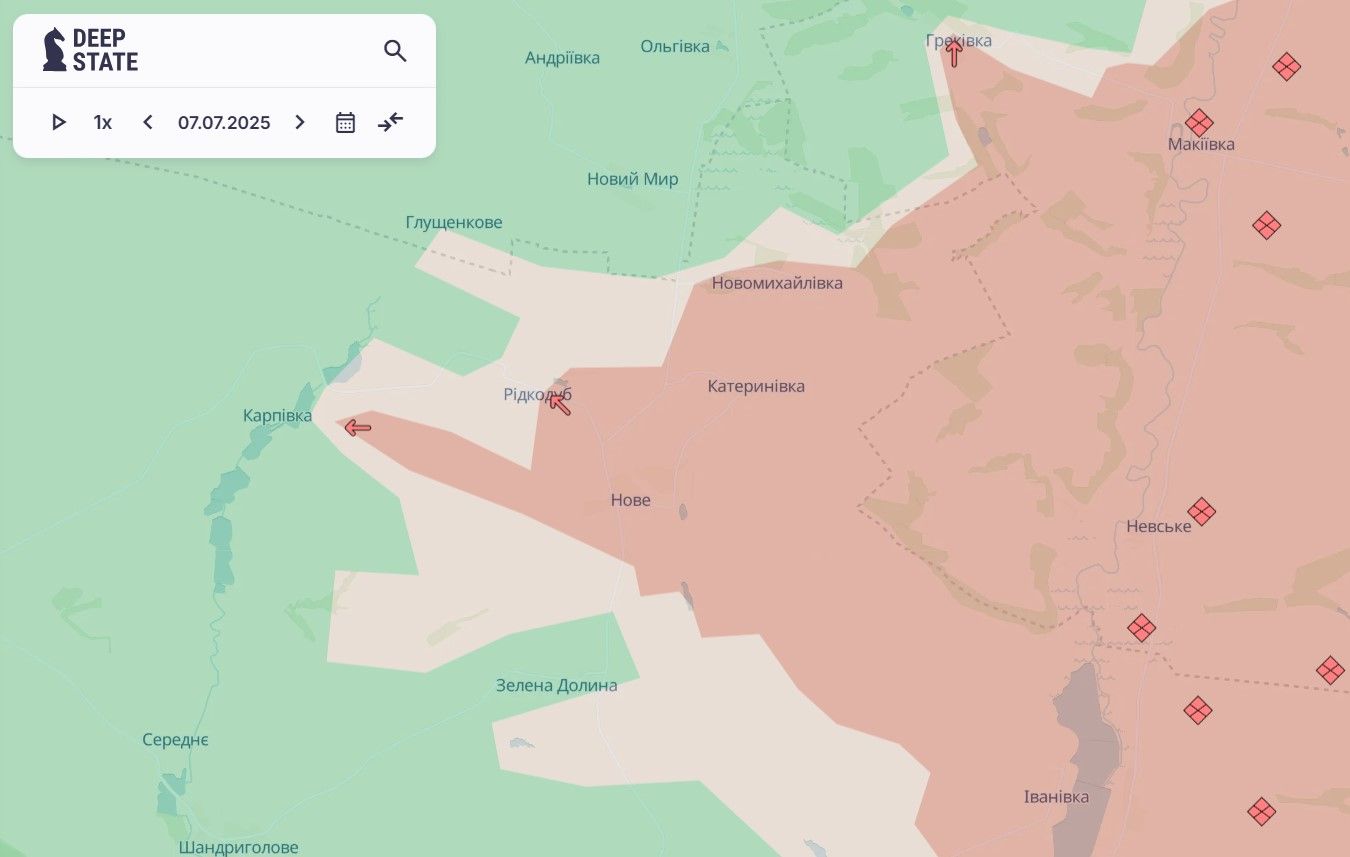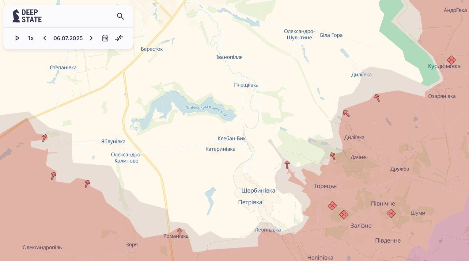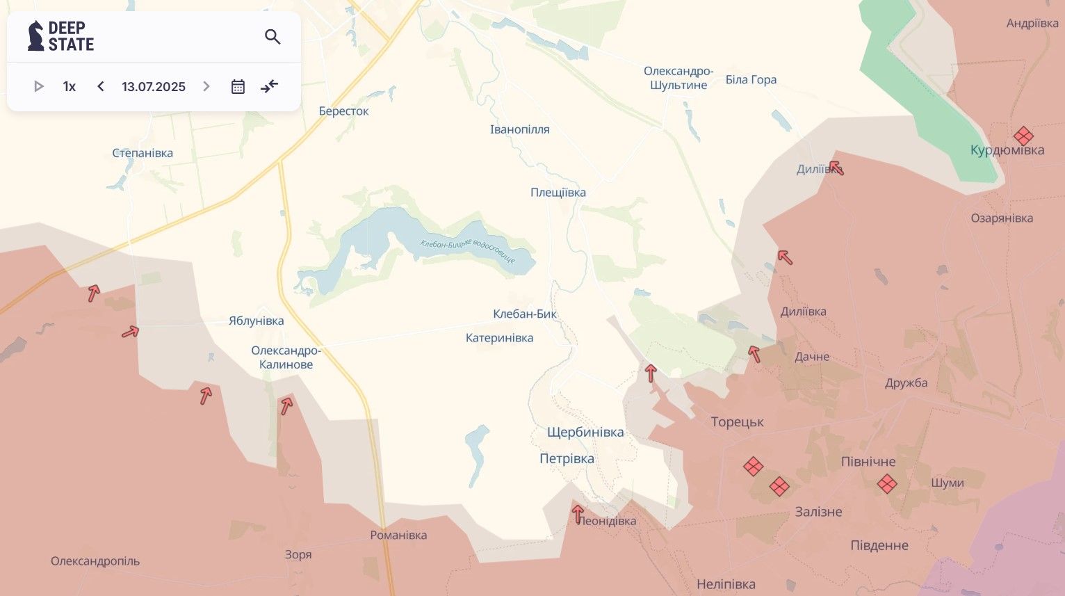 На прошлой неделе россияне оккупировали село Разино и прорвались в Новоторецкое, что на северо-востоке от Покровска. Оккупанты пытаются двигаться на запад в направлении Днепропетровской области. Однако активность россиян на этом участке создает угрозы не только для Покровска и Мирнограда. На прошлой неделе из-за приближения линии фронта в Доброполье враг начал применять FPV-дроны для ударов по городу. Например, только за день 8 июля россияне применили 40 дронов для ударов по Доброполью. Также под постоянными атаками трасса Доброполье – Краматорск.