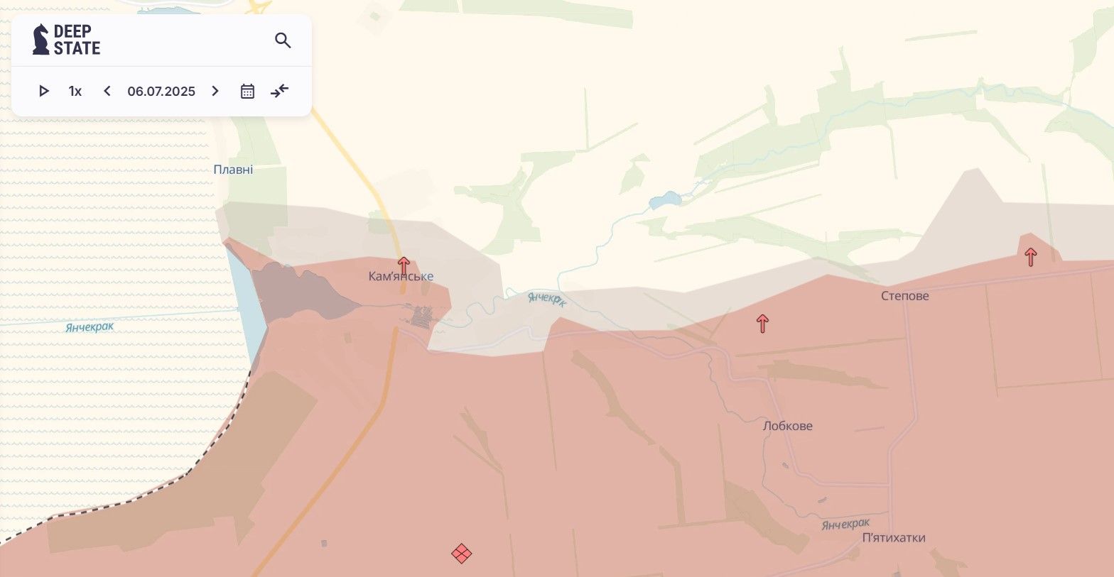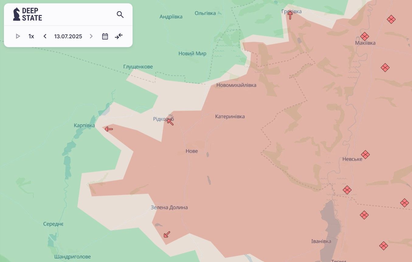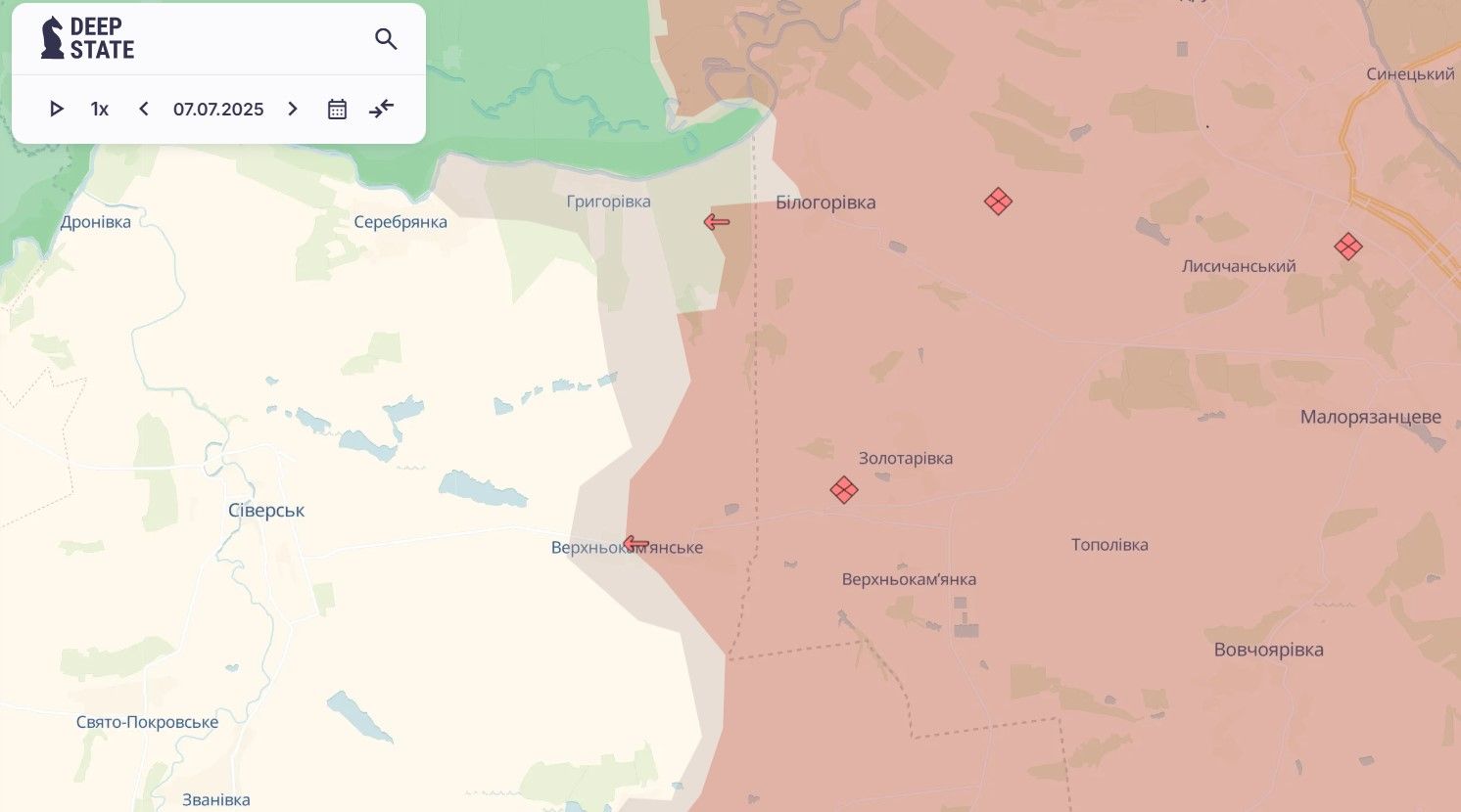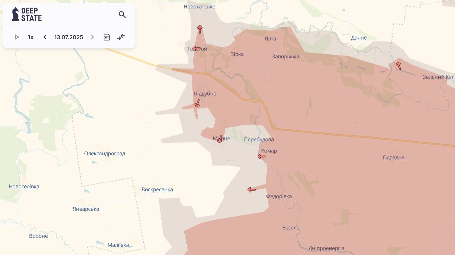 На прошлой неделе россияне оккупировали село Разино и прорвались в Новоторецкое, что на северо-востоке от Покровска. Оккупанты пытаются двигаться на запад в направлении Днепропетровской области. Однако активность россиян на этом участке создает угрозы не только для Покровска и Мирнограда. На прошлой неделе из-за приближения линии фронта в Доброполье враг начал применять FPV-дроны для ударов по городу. Например, только за день 8 июля россияне применили 40 дронов для ударов по Доброполью. Также под постоянными атаками трасса Доброполье – Краматорск.