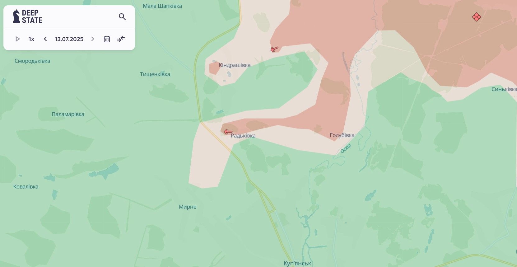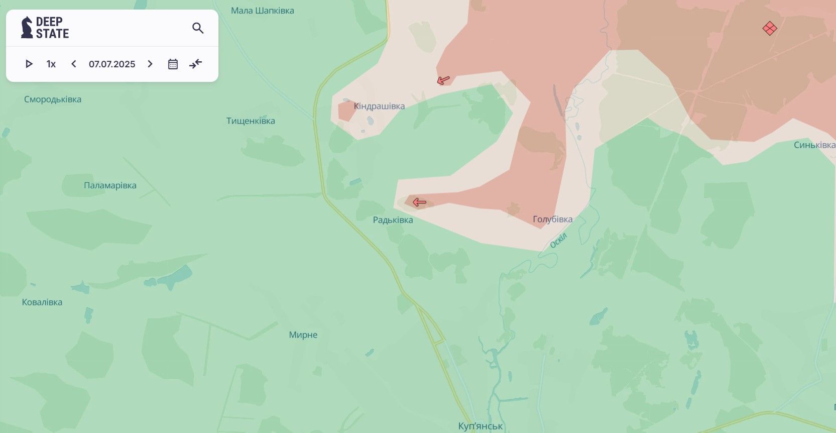 В то же время продолжаются бои севернее Купянска. Попытки россиян улучшить свое положение в Кондрашовке не достигли успеха, однако россияне прорвались в Радьковку и продвинулись там. Далее враг атакует в сторону села Мирное, что можно рассматривать как попытку окружить Купянск.
