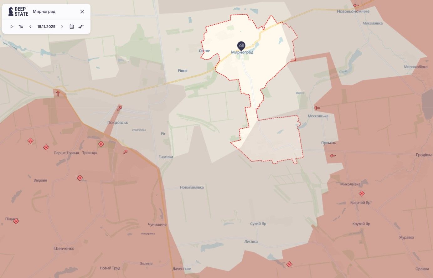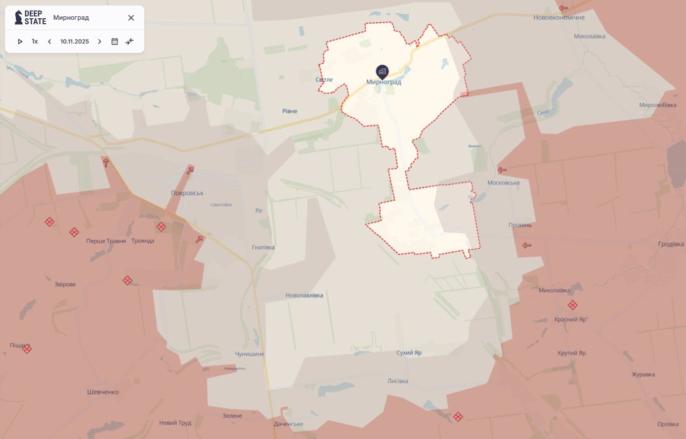 А вот в районе соседнего Мирнограда ситуация совсем другая. Россияне продвинулись в районе села Луч. В то же время других продвижений не зафиксировано, но в серой зоне оказалась уже южная часть Мирнограда.