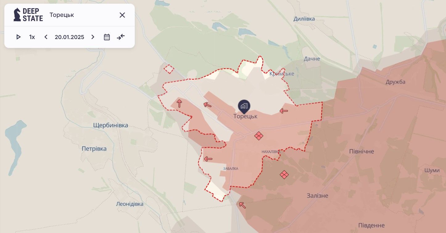 На прошлой неделе врагу удалось продвинуться в северной части Торецка в направлении Крымского, а также в западном направлении вплоть за пределы города.