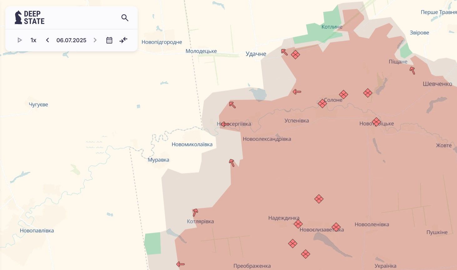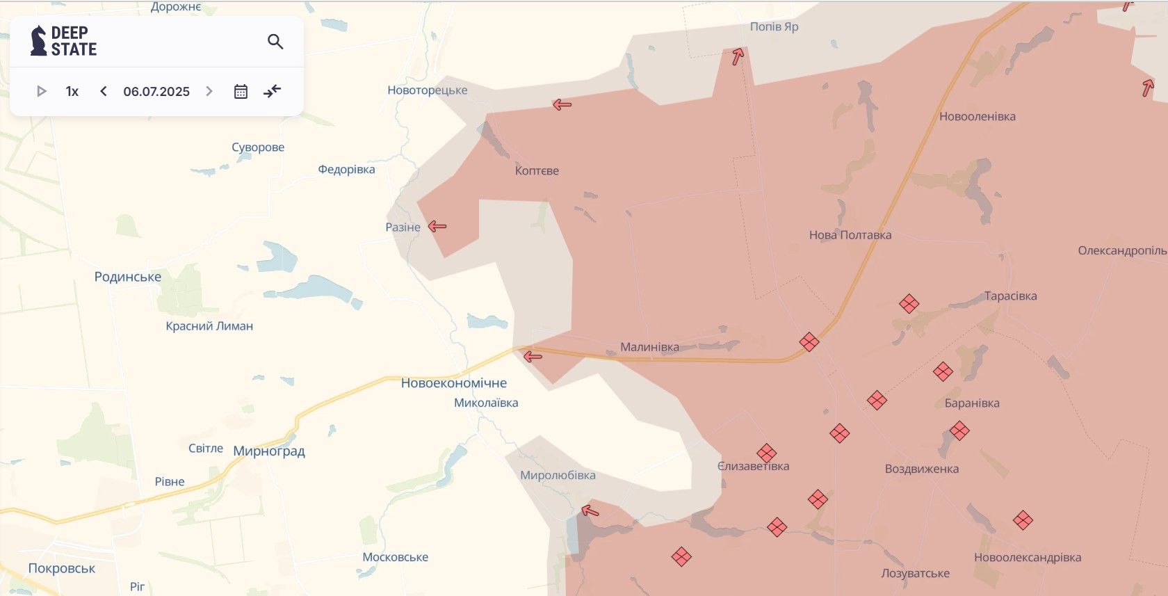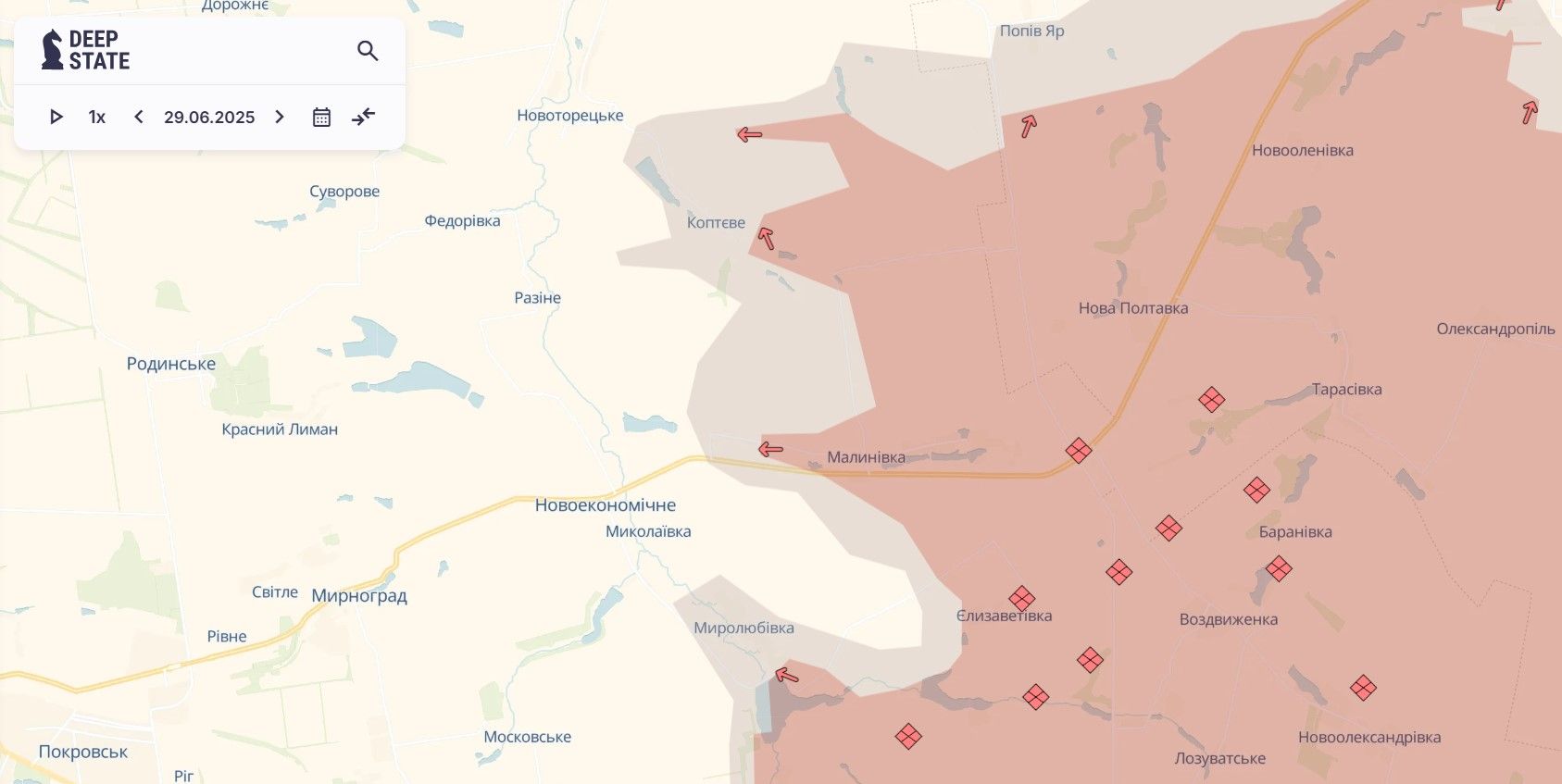 На прошлой неделе у врага были продвижения на северо-восток от Покровска, где россияне атакуют для окружения Покровска и наступления на Доброполье. Враг оккупировал село Коптево, прорвался в Разино и продвинулся в Поповом Яру. Сейчас очень тяжелая ситуация складывается для поселка Новоэкономическое.