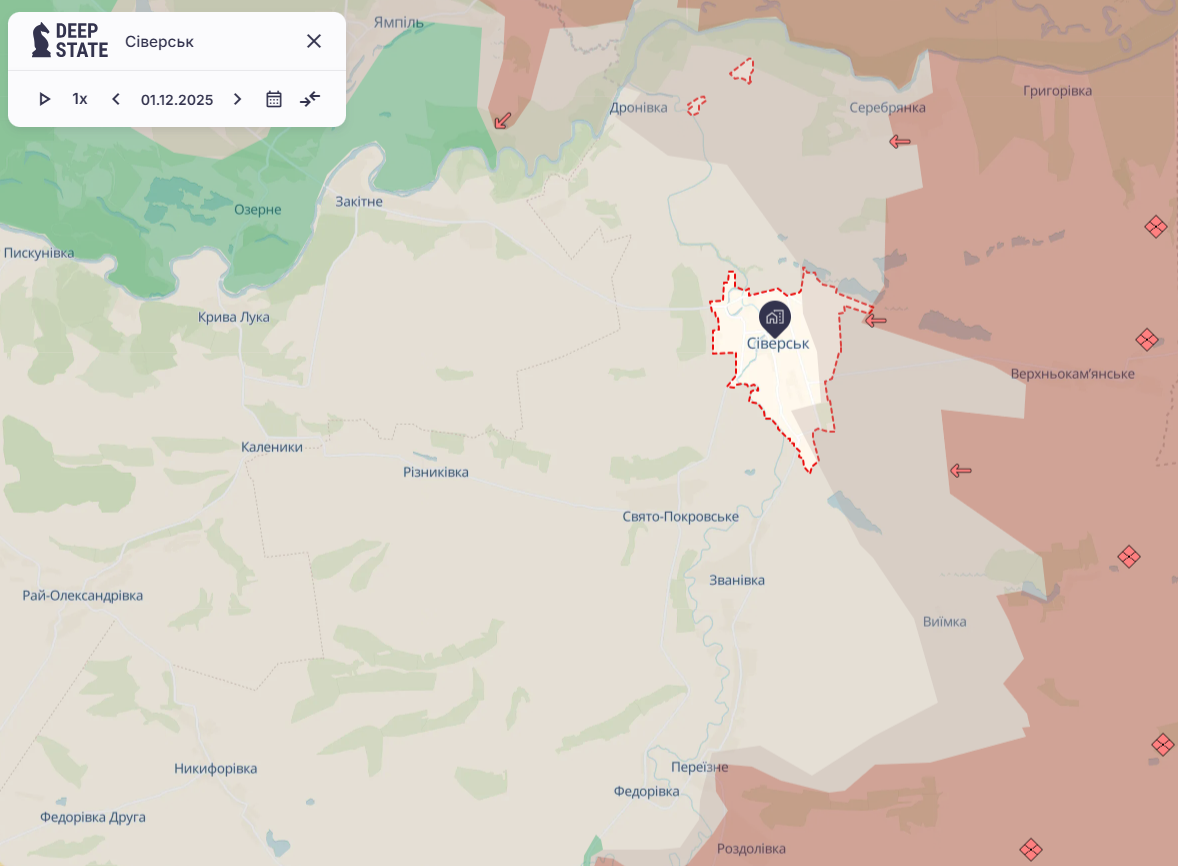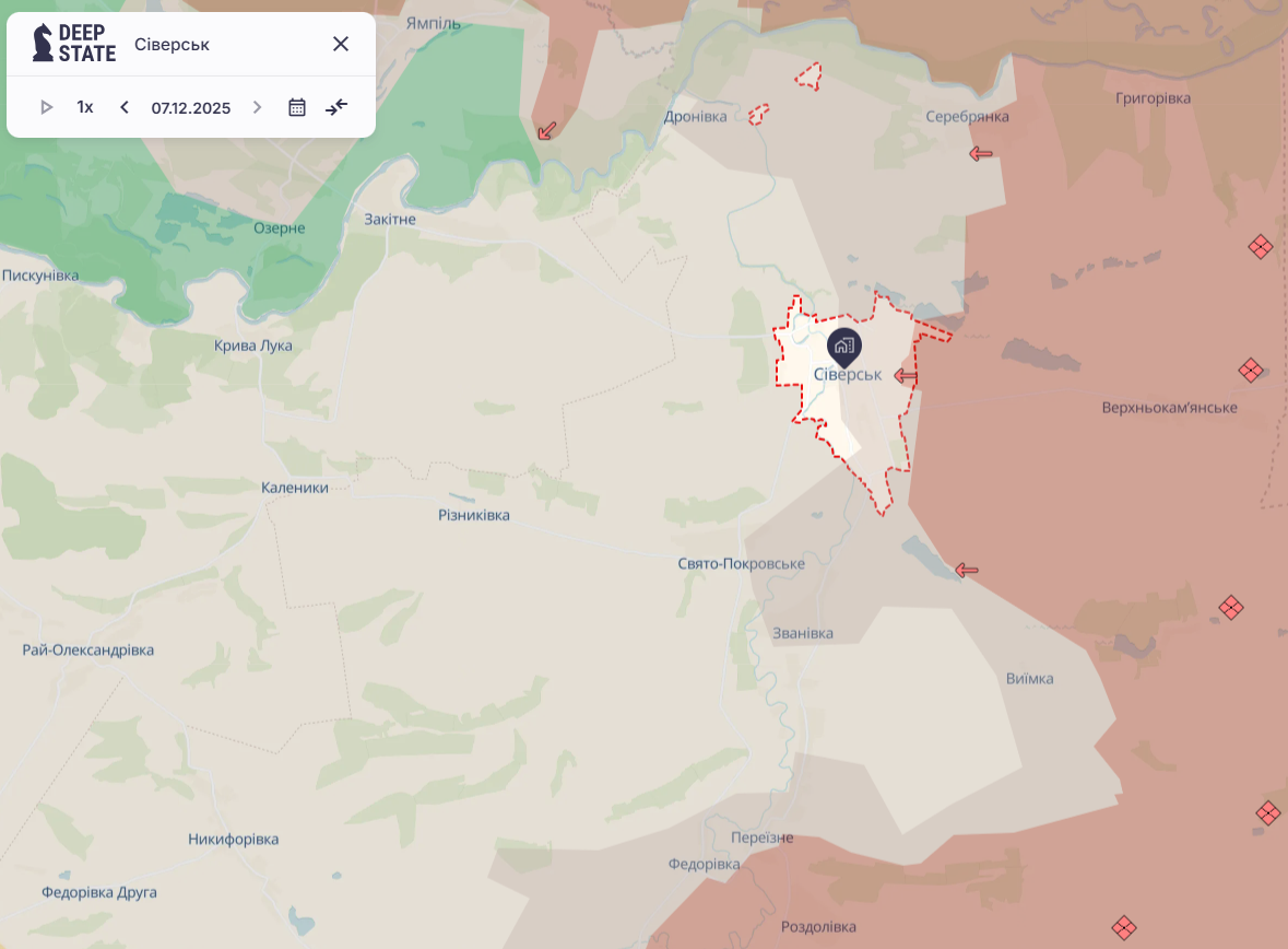 В соседнем Северске ситуация далеко не легче. Серая зона охватывает теперь абсолютное большинство города. В то же время россияне закрепились на восточных окраинах Северска.