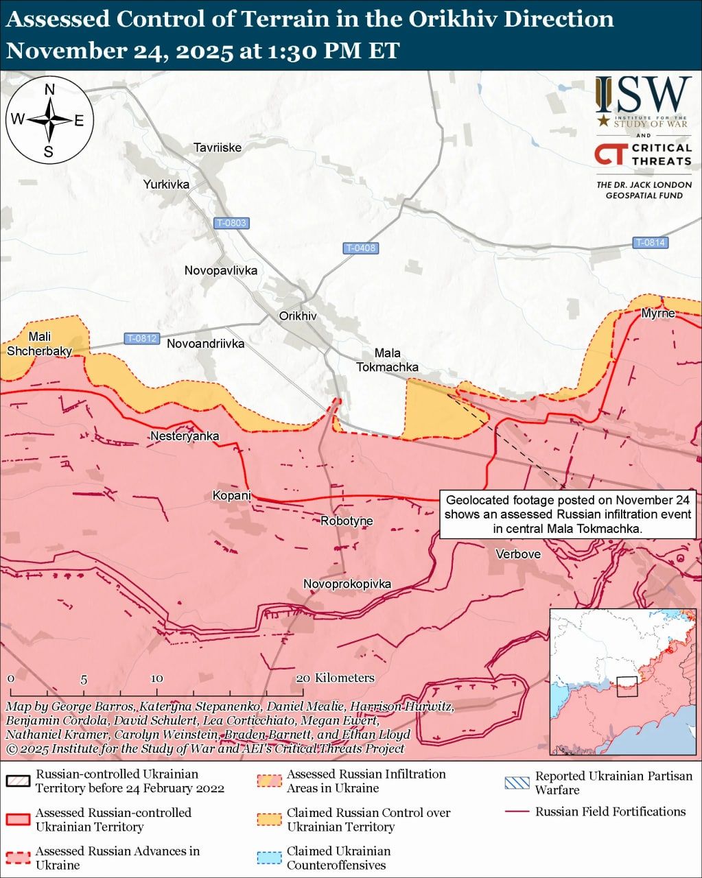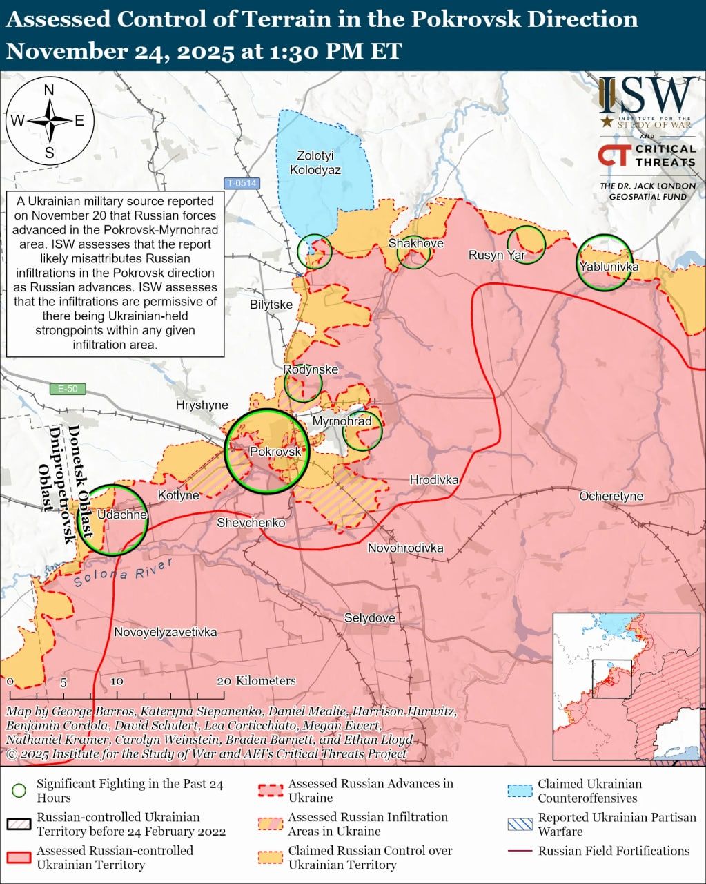Об этом пишет 24 Канал со ссылкой на обновленный анализ ISW. Украинские силы сохраняют присутствие и дают отпор врагу в Покровске, что свидетельствует о том, что оккупанты, вероятно, пока не могут быстро захватить город.