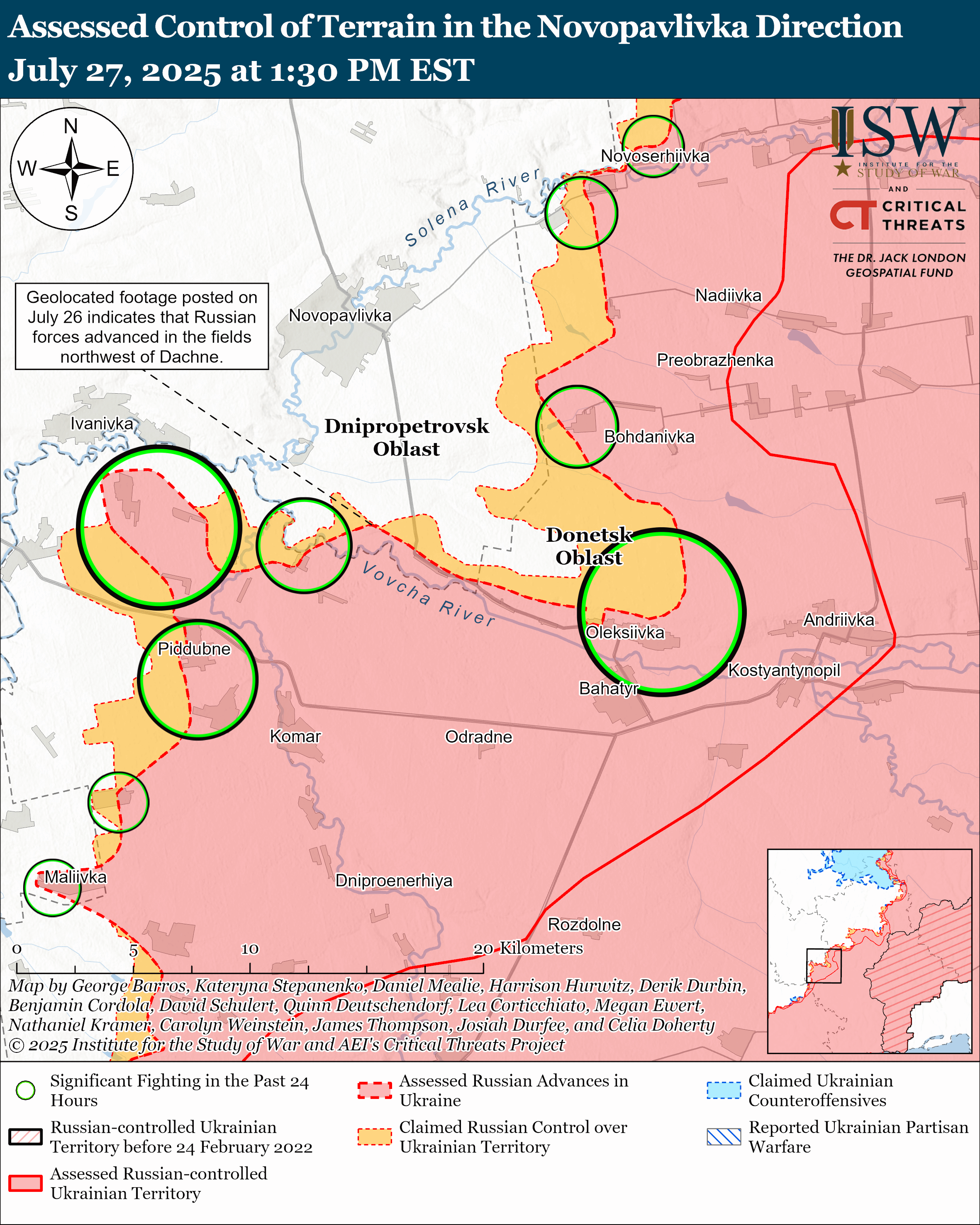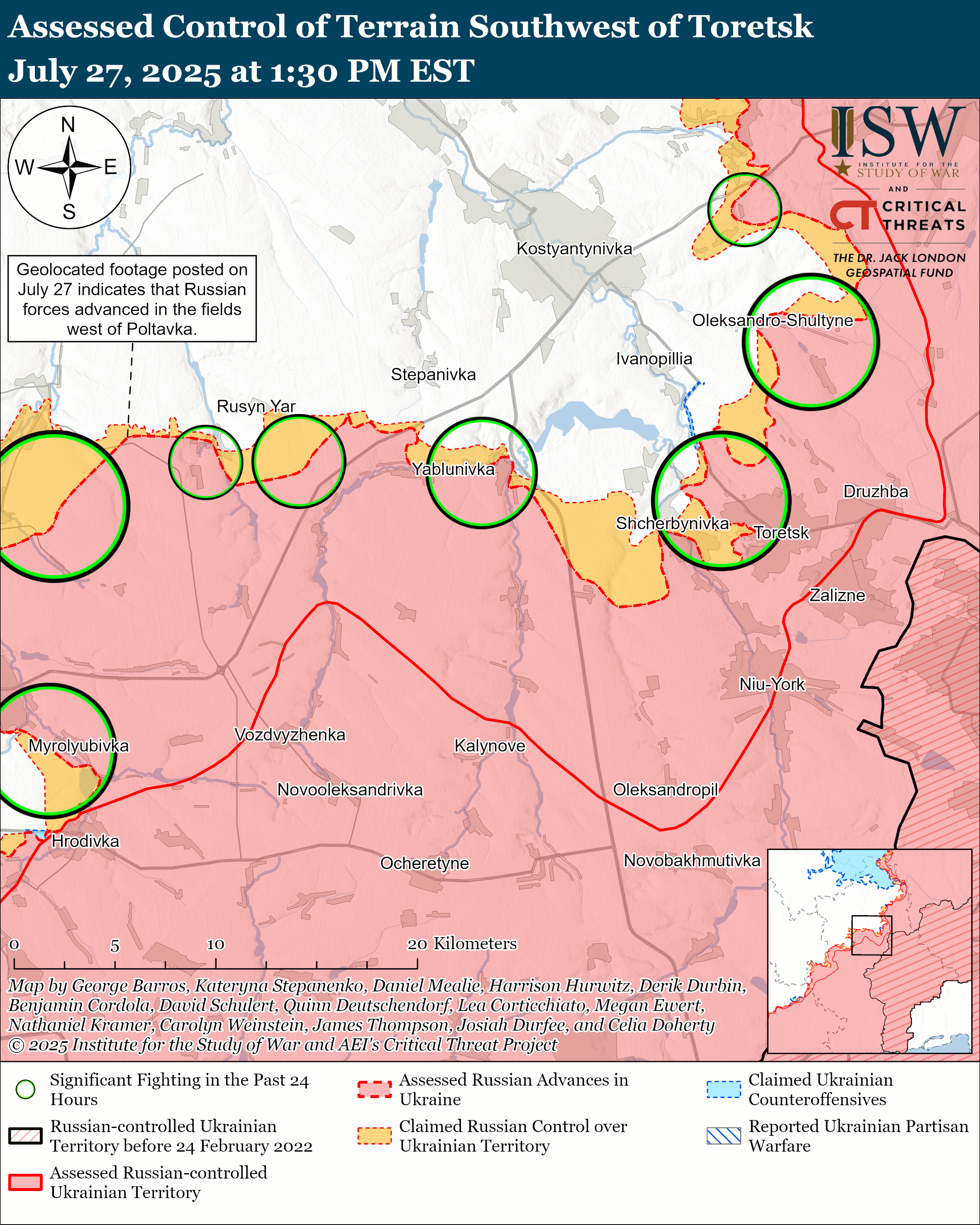 Геолокационные кадры, опубликованные 27 июля, свидетельствуют о том, что российские войска недавно продвинулись на запад от Полтавки (на северо-запад от Торецка). Дополнительные геолокационные видеозаписи, опубликованные 25 июля, свидетельствуют о том, что российские войска недавно продвинулись на юго-восток от Русиного Яра (к северо-западу от Торецка)
