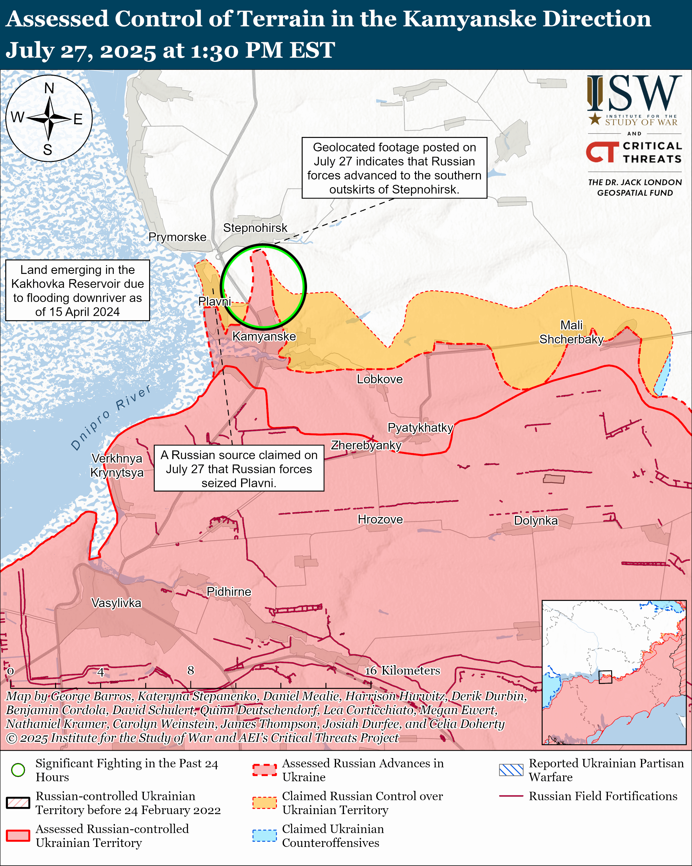 - 27 июля российские войска продолжали ограниченные наступления на Херсонском направлении, но не продвинулись вперед.