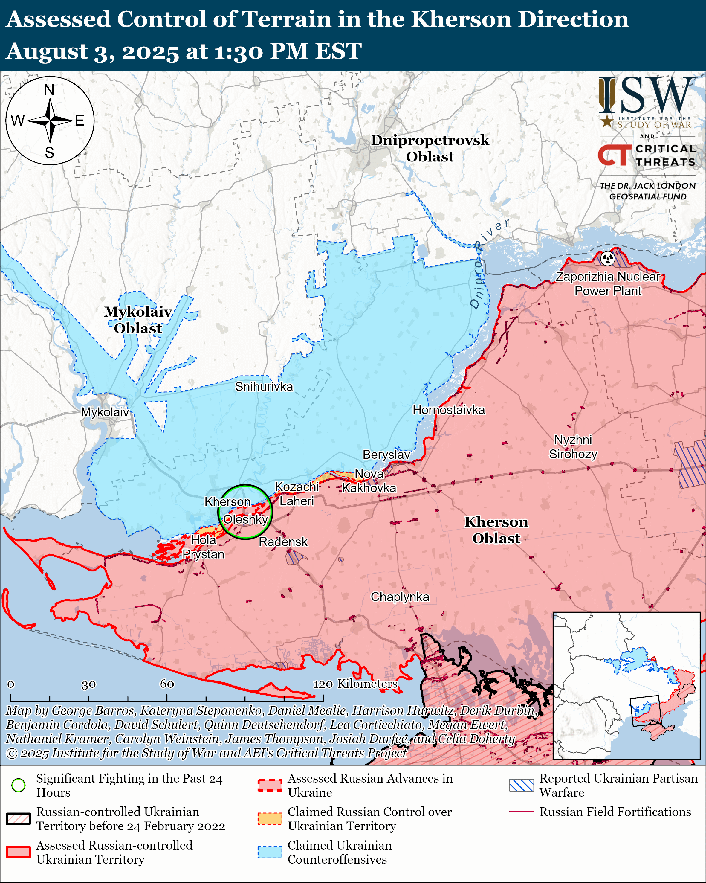 - 3 августа российские войска продолжили наступательные операции на Великомихайловском направлении, но подтвержденных успехов не достигли. Такая же ситуация на востоке Запорожской области.