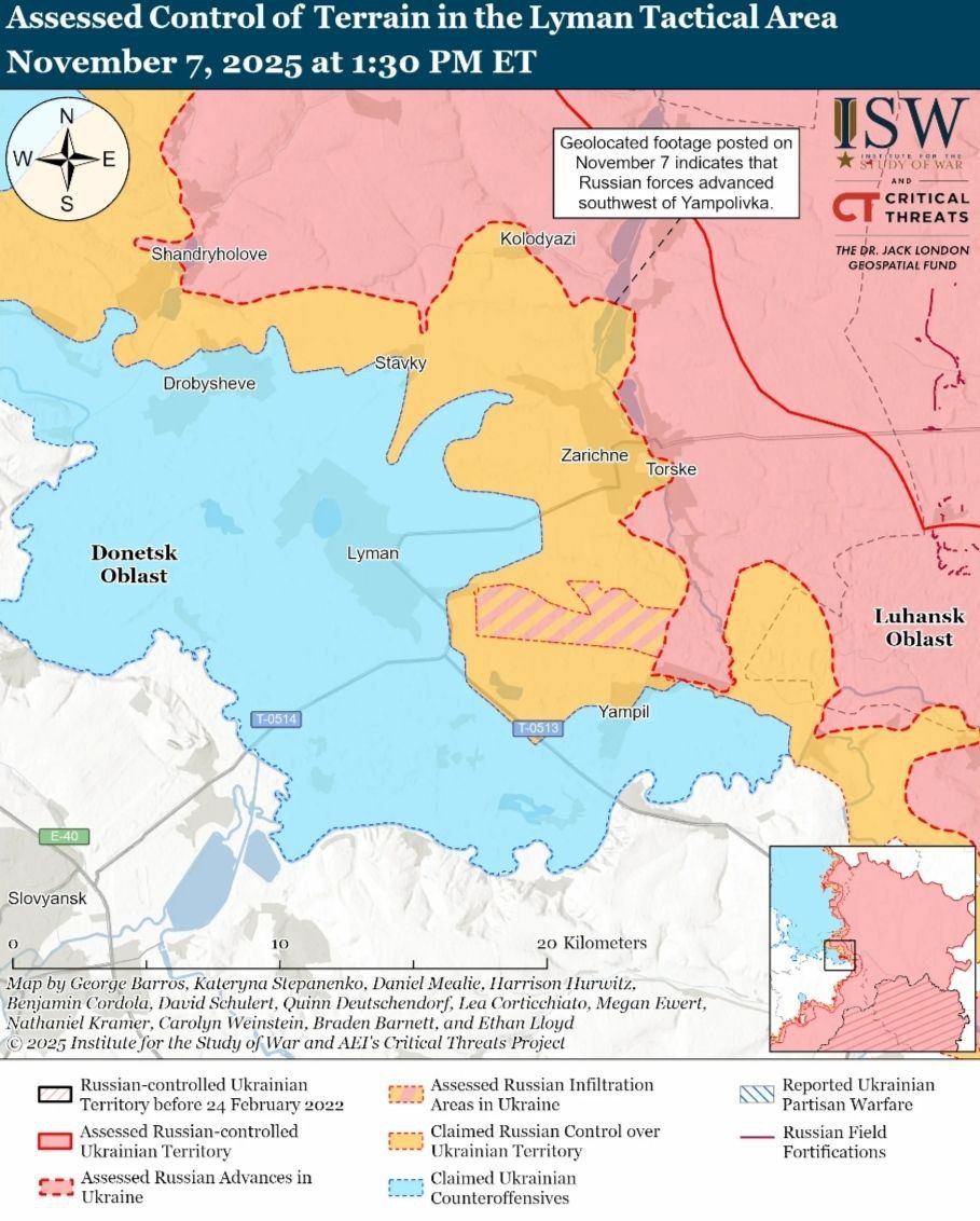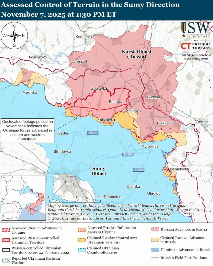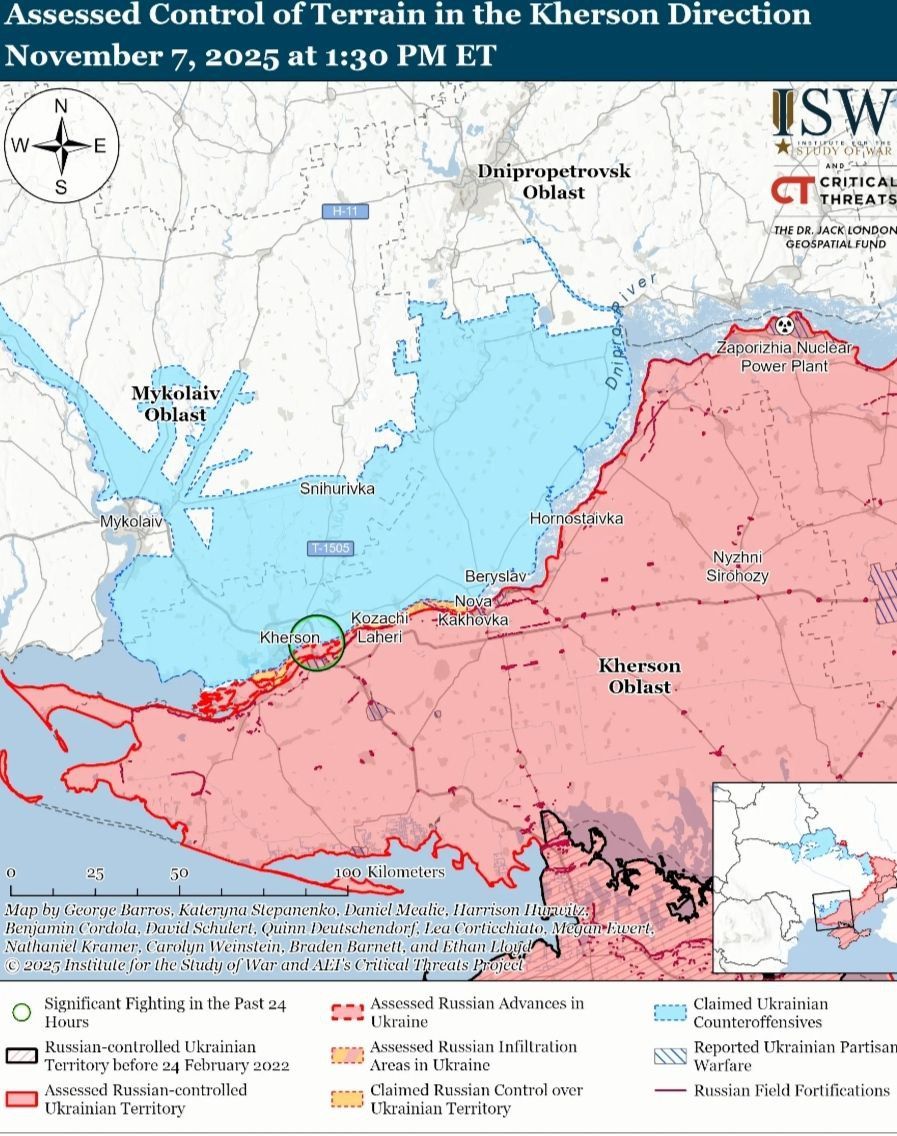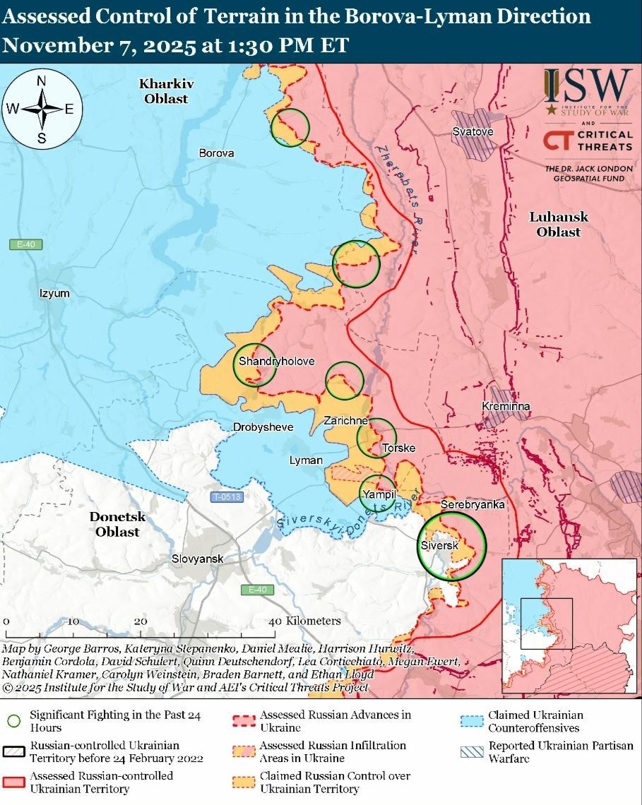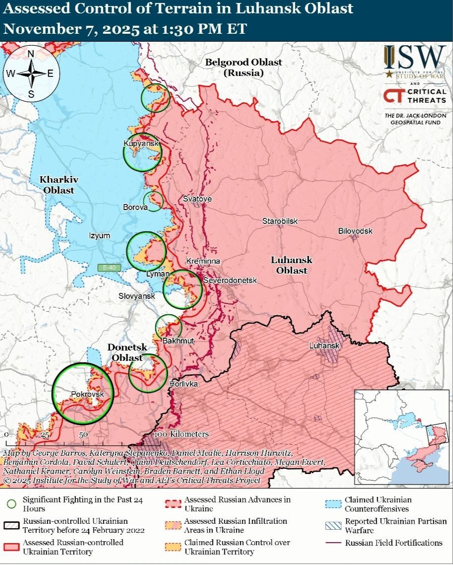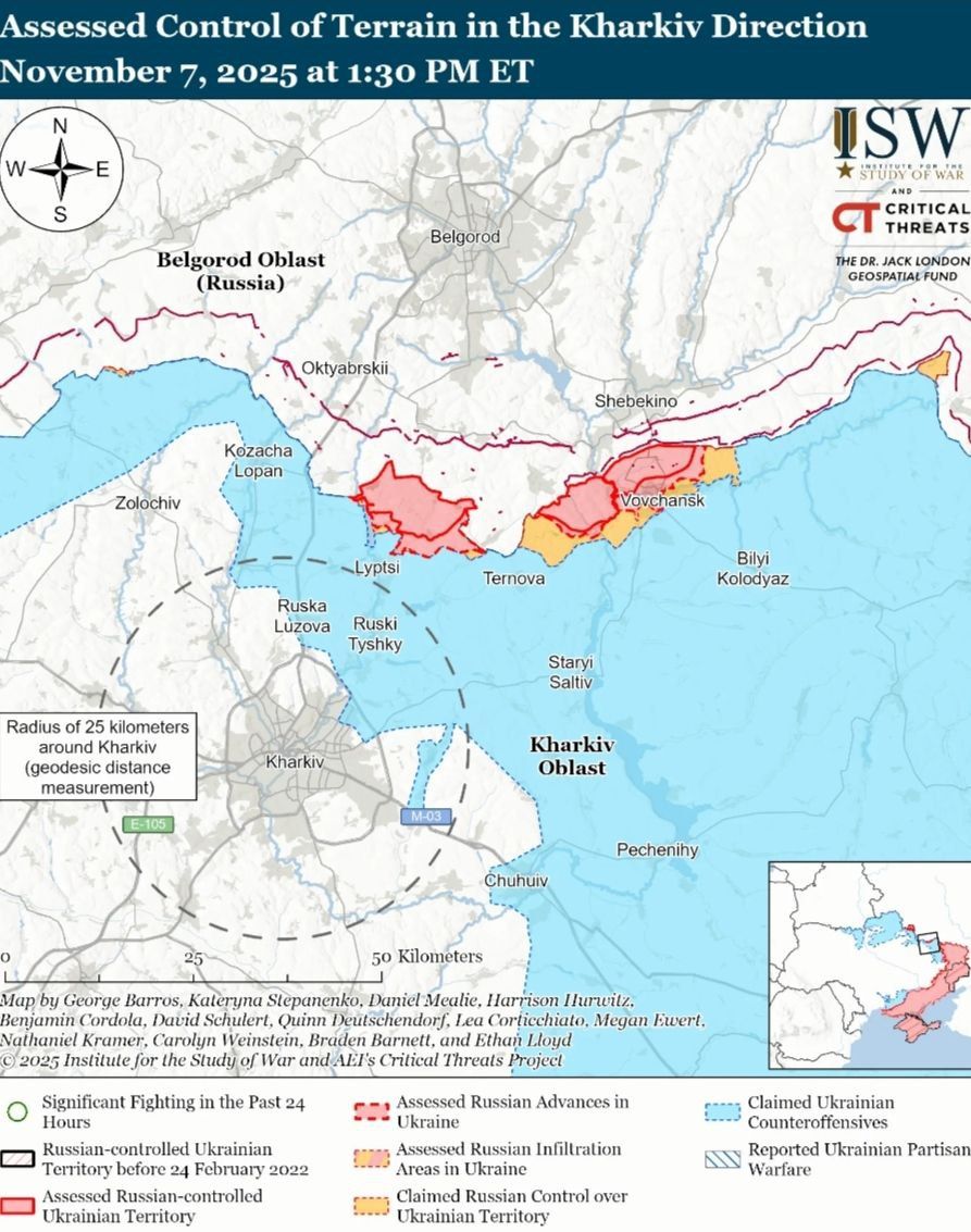 - 7 ноября российские войска продолжали наступательные операции на севере Харьковской области и на Купянском направлении, но не достигли подтвержденного прогресса.