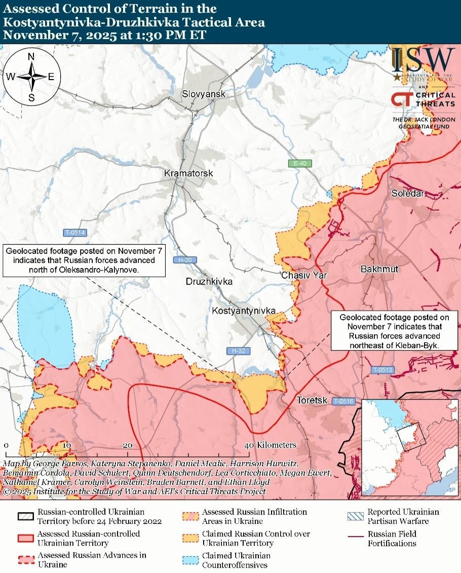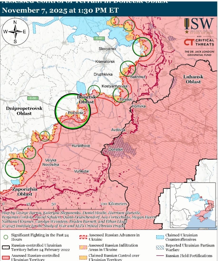 Кроме этого, 7 ноября в ISW сообщали, что россияне усиливают присутствие своих войск на Покровском направлении, "вероятно, для закрепления достижений, полученных благодаря миссиям по инфильтрации и дальнейшего продвижения через город". Геолокационные видеозаписи свидетельствуют о том, что российские войска продвинулись на юго-восток от села Балаган (к востоку от Покровска).