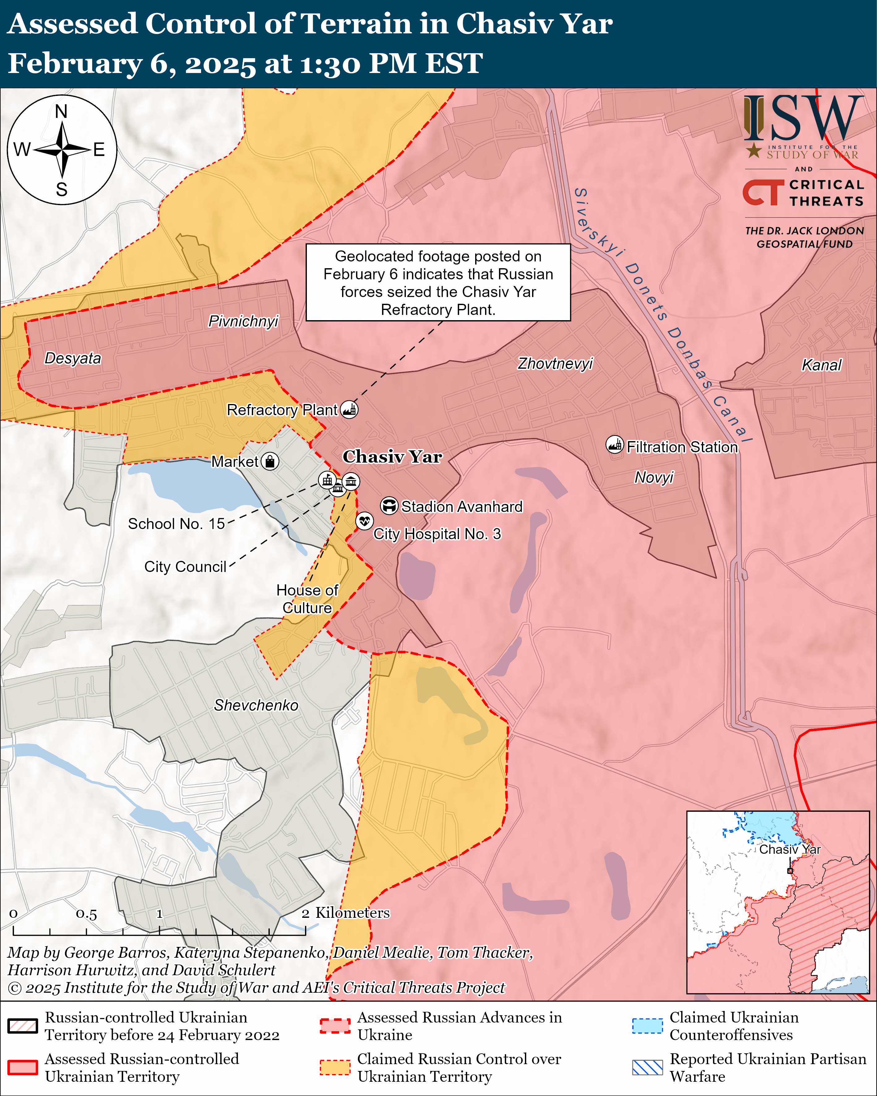 - Захватчики недавно продвинулись в Часовом Яре на фоне продолжения наступательных операций возле самого города и на юг возле Ступочек 5 и 6 февраля. Геолокационные кадры, опубликованные 6 февраля, показывают, что российские войска недавно продвинулись на запад от центрального огнеупорного завода в Часовом Яре и, вероятно, захватили это предприятие полностью.