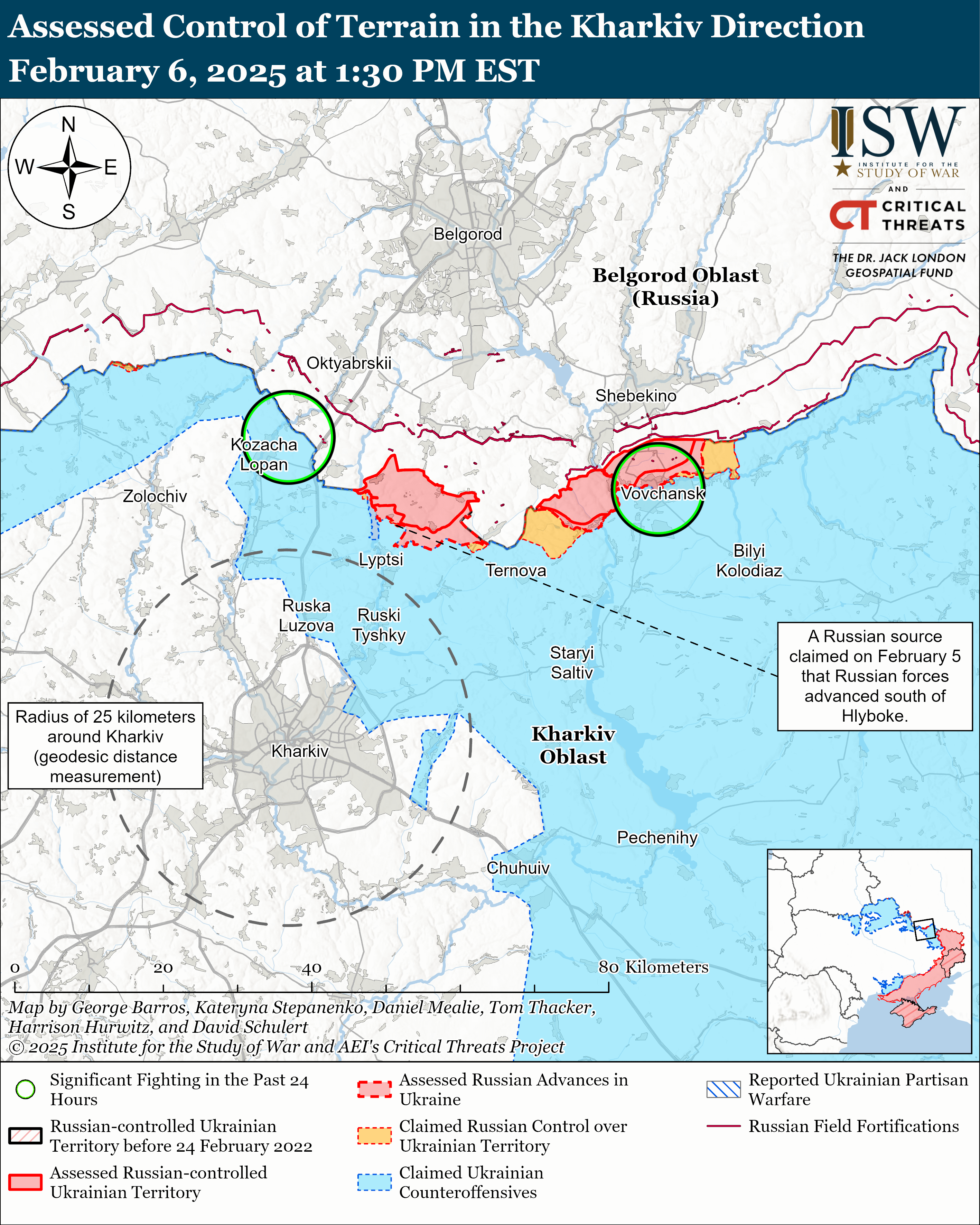 - Российские войска 5 и 6 февраля продолжали наступательные операции севернее Харькова вдоль российско-украинской границы возле Казачьей Лопани и на северо-восток от Харькова вблизи Волчанска, но не сделали ни одного подтвержденного продвижения.
