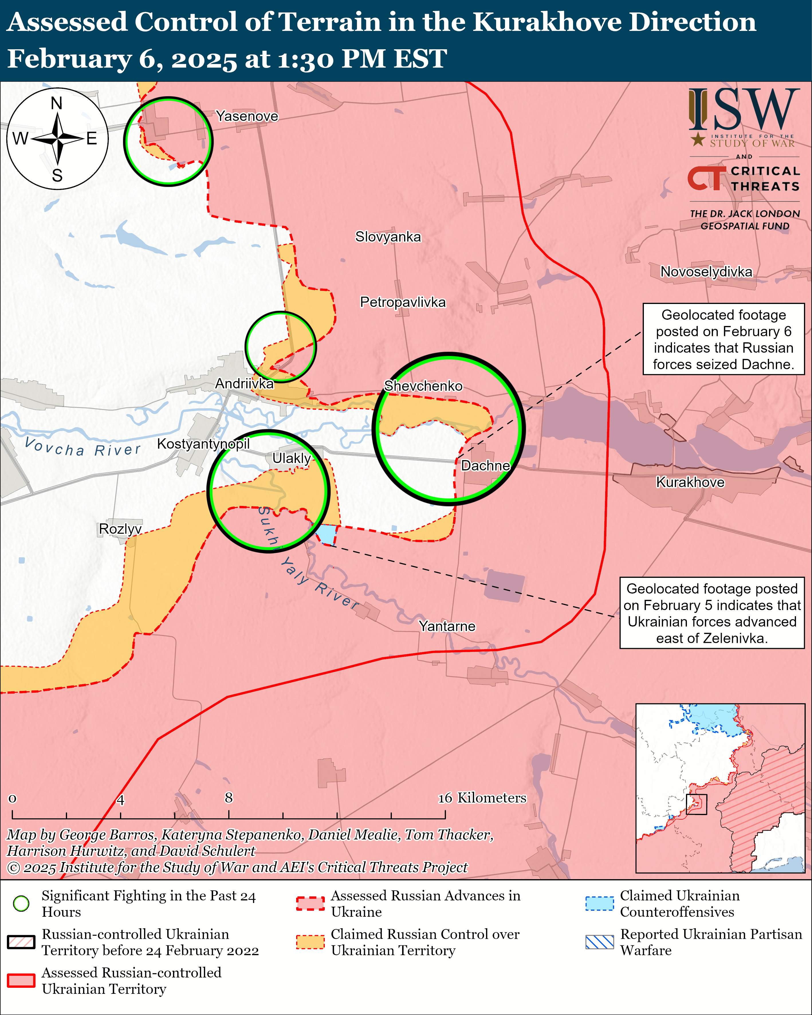 - Украинские и российские войска недавно продвинулись на запад от Курахово на фоне наступательных операций в этом районе 6 февраля. Российские войска продолжали наступать на северо-запад от Курахово возле Шевченко и Андреевки, на запад от Курахово вблизи Дачного и Константинополя и на юго-запад от Курахово возле Улаклов. В то же время геолокационные кадры, опубликованные 6 февраля, показывают, что украинские силы недавно продвинулись на восток от Зеленовки.