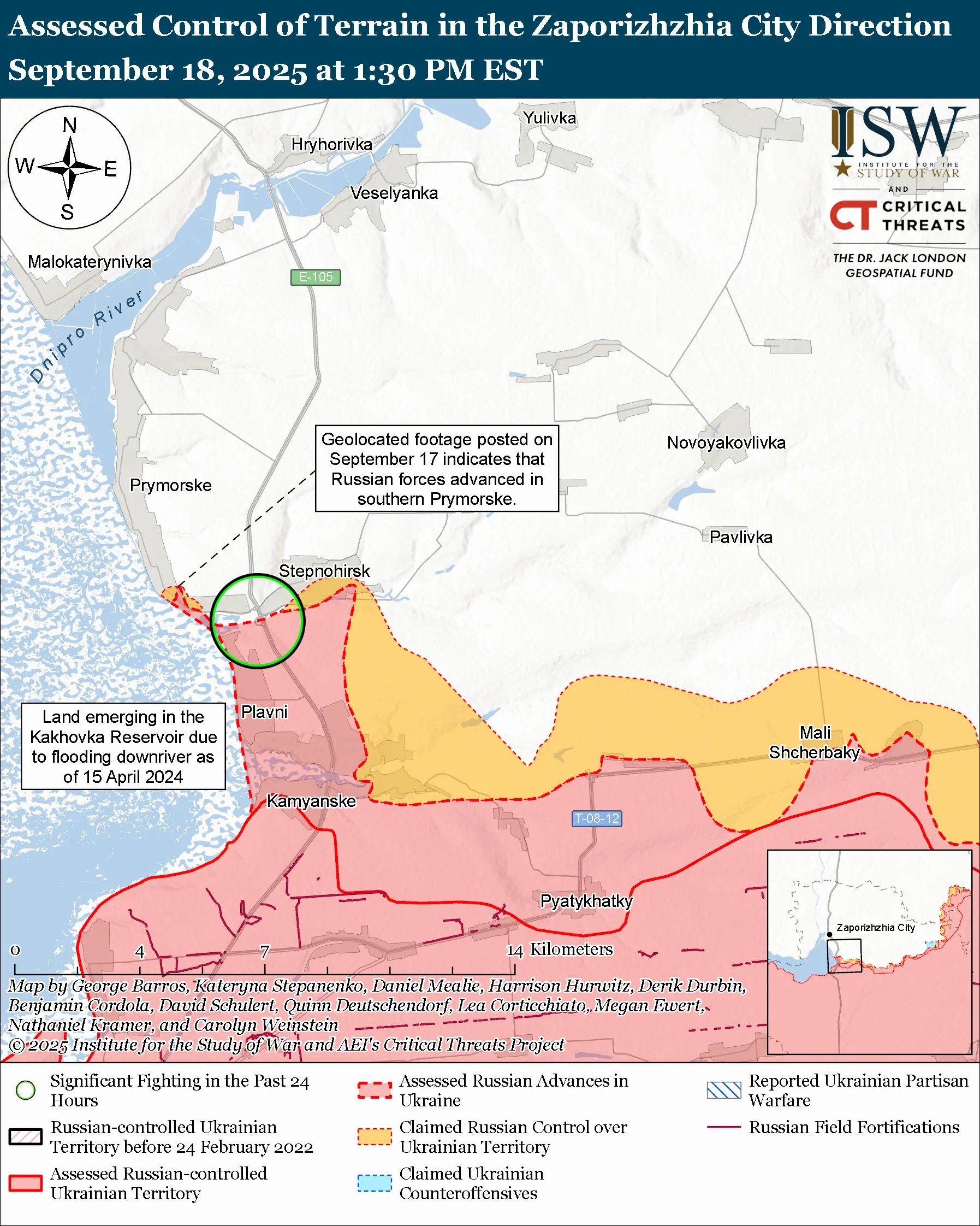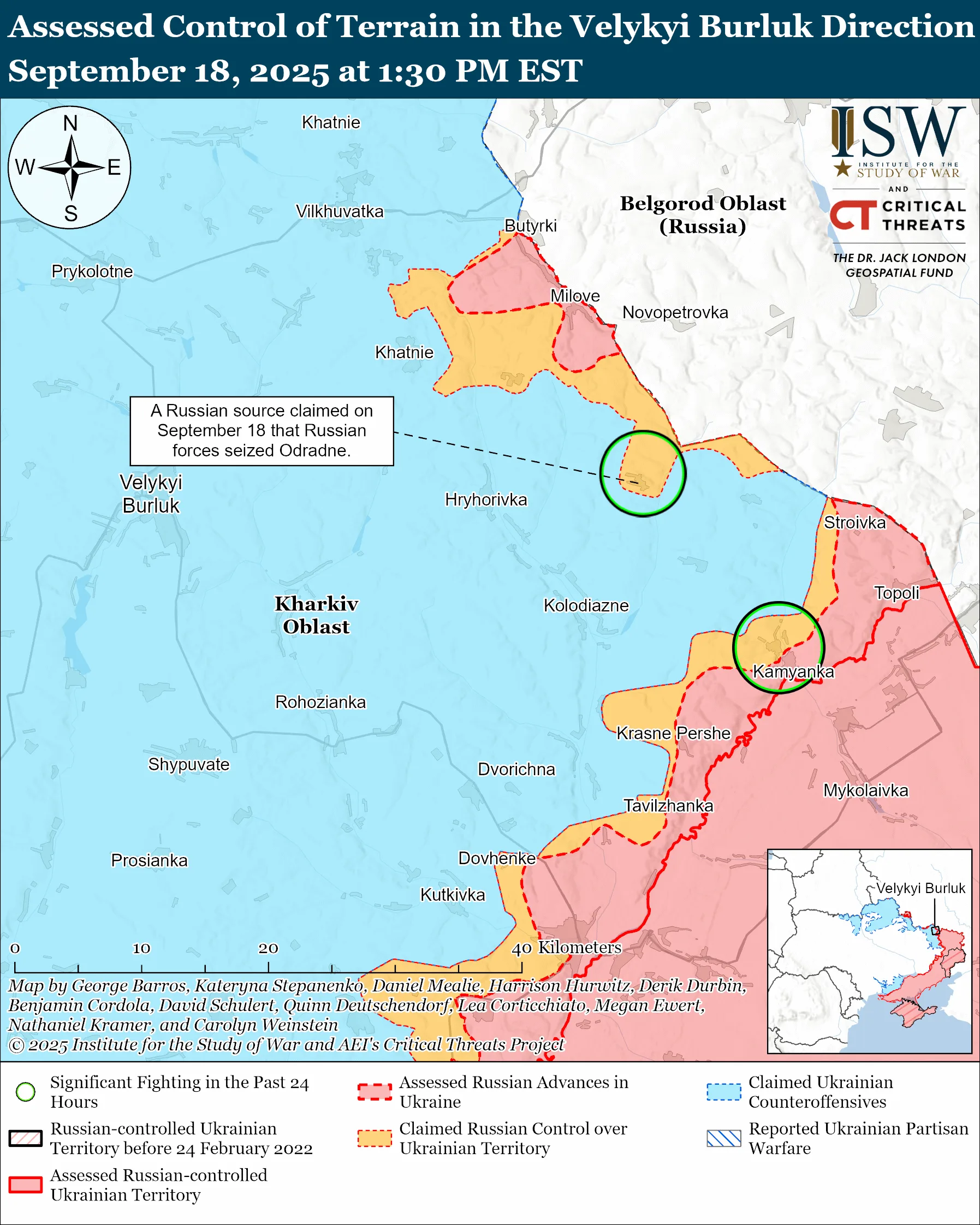 Российские войска по состоянию на утро 19 сентября, по данным Института изучения войны, продвинулись вблизи Лимана и Великомихайловки, а также в районе Запорожской области. Их цель, в частности, захватить остальную Луганщину, продвинуться на Харьковщине и окружить часть Донецкой области.