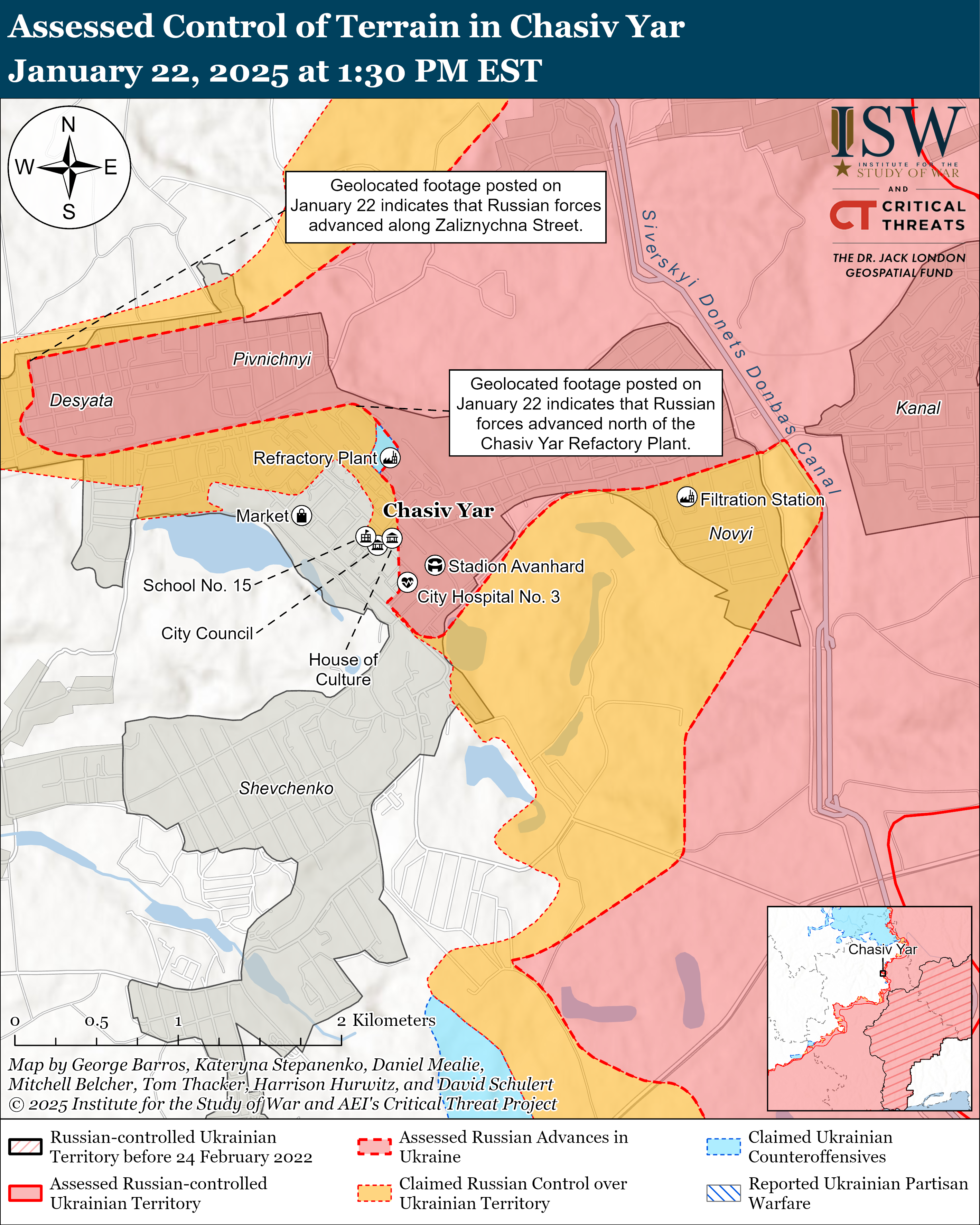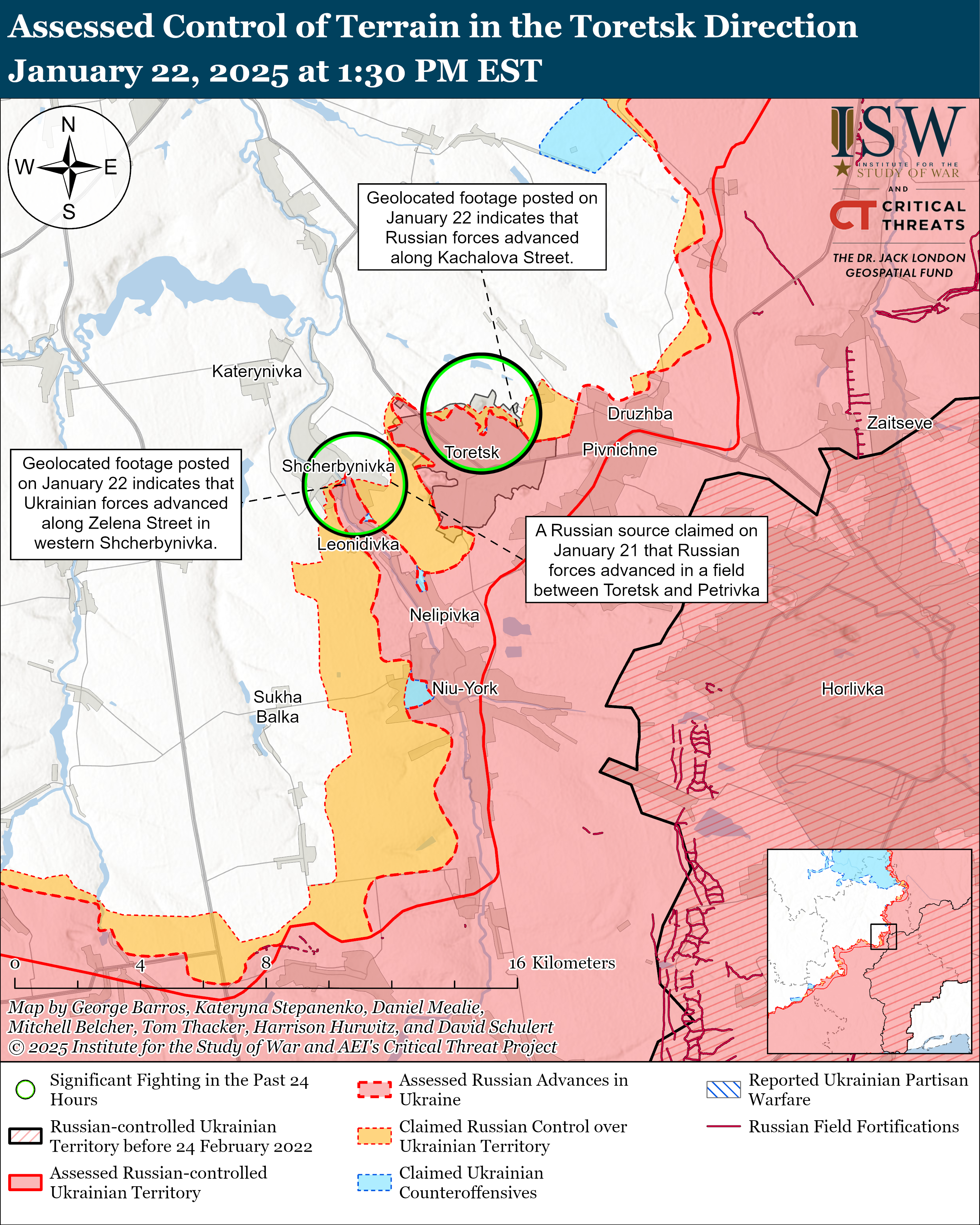- Как украинские, так и российские военные недавно продвинулись на Торецком направлении на фоне продолжения наступательных действий в этом районе 22 января. Геолокационные кадры, опубликованы 11 января и изучены 22 января, показывают, что российские войска продвигались по улицам Качалова и Пузанова на севере Торецка. В то же время ВСУ продолжают держать позиции в самом городе.
