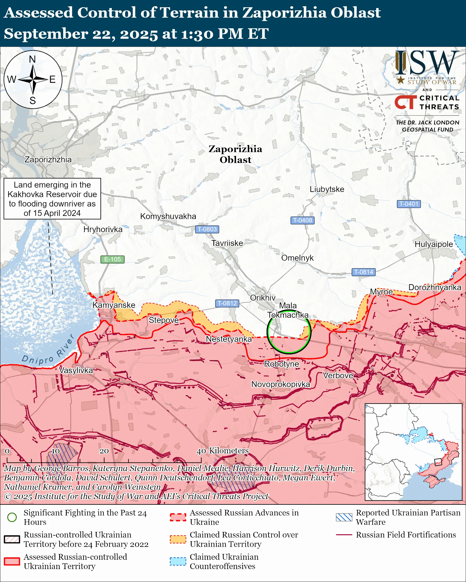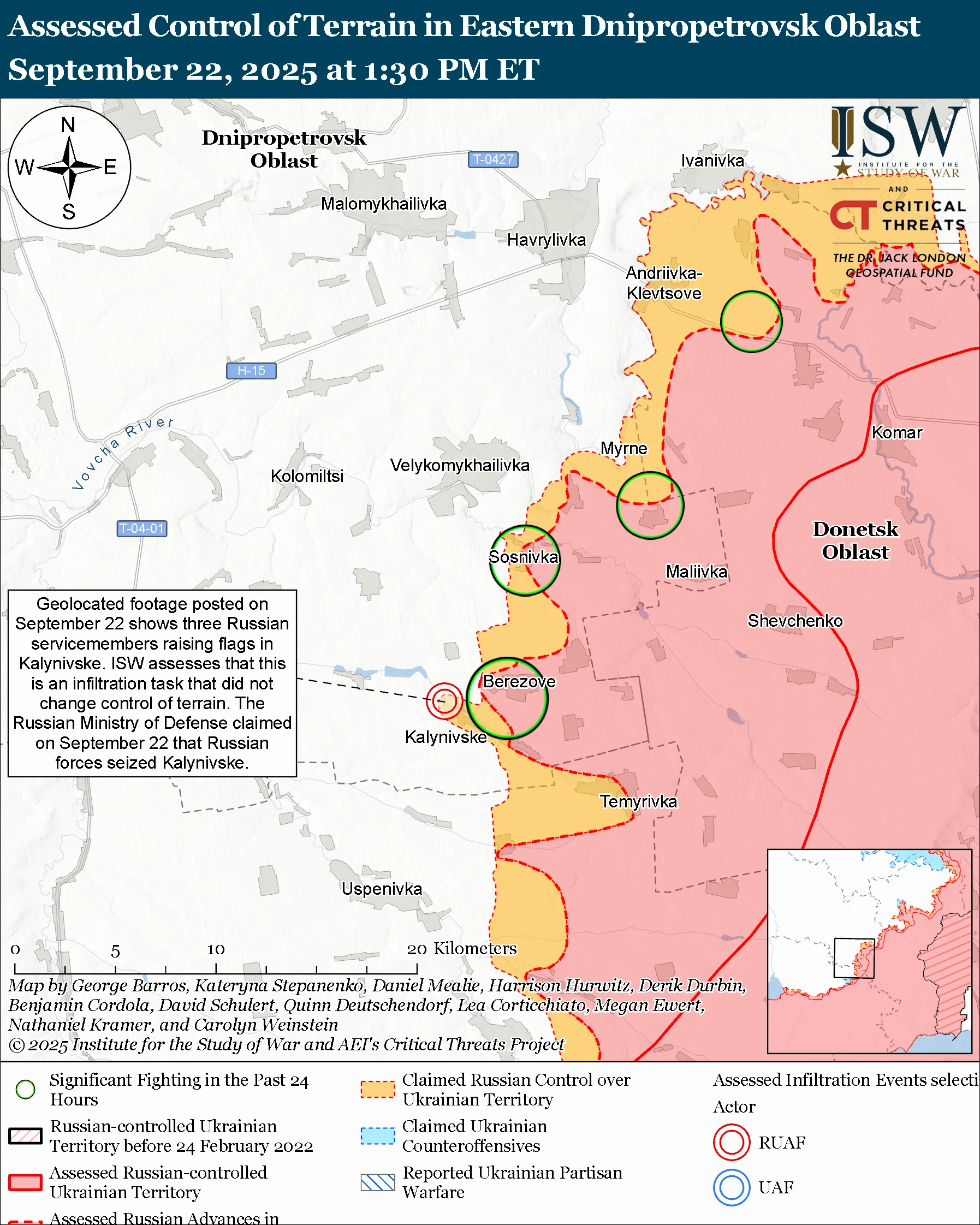 - 22 сентября российские войска продолжили наступательные операции на Новопавловском направлении, но не продвинулись вперед. Россияне наступали на юго-восток от Новопавловки в районе Дачного, на юг от Новопавловки в районе Филии и на юго-запад от Новопавловки в районе Зеленого Гая и Ивановки.