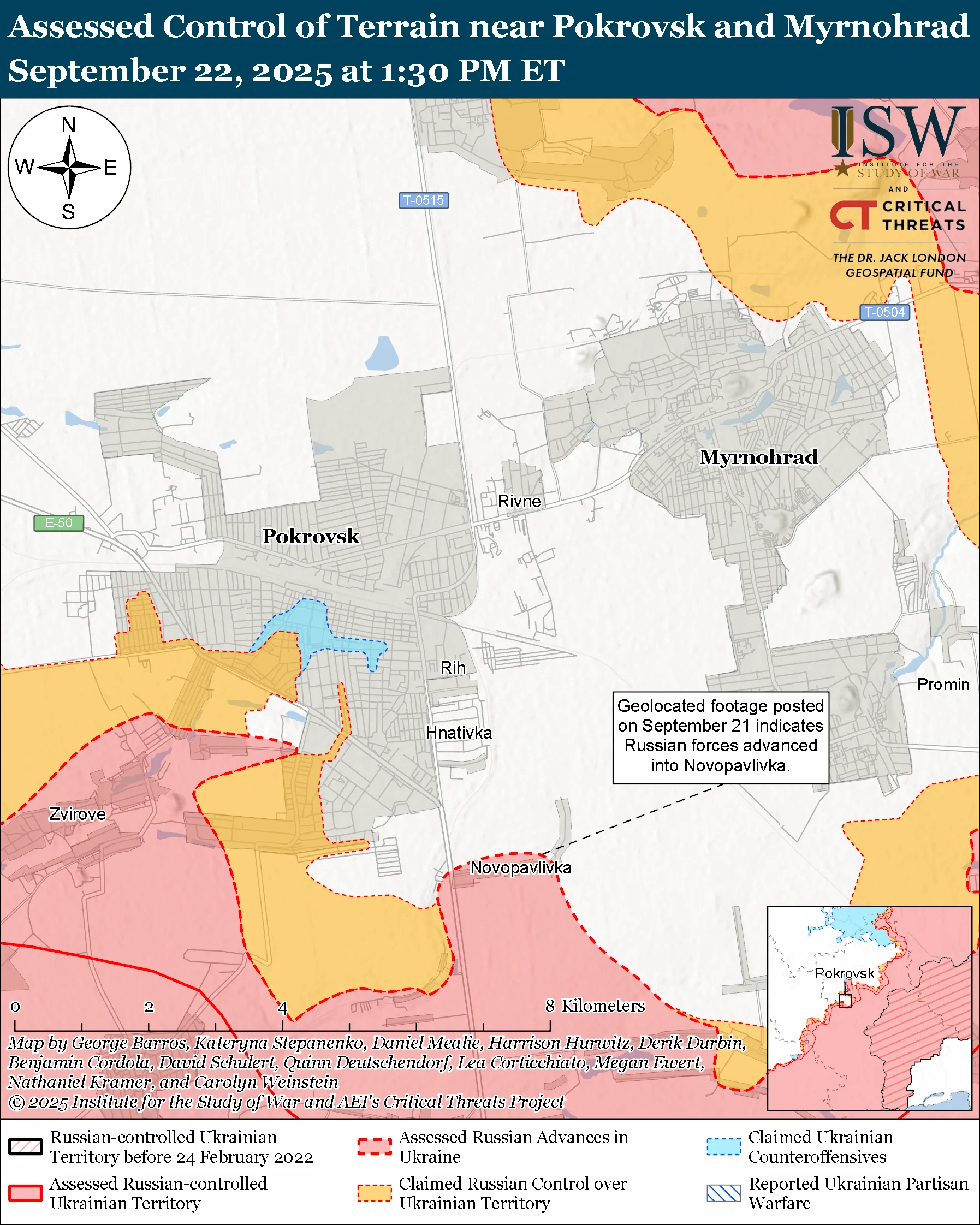 - Оккупанты недавно продвинулись на Покровском направлении. Видеозаписи, опубликованы 20 сентября и геолоцированные 21 сентября, свидетельствуют, что российские войска недавно продвинулись к Новопавловке, что к югу от Покровска.