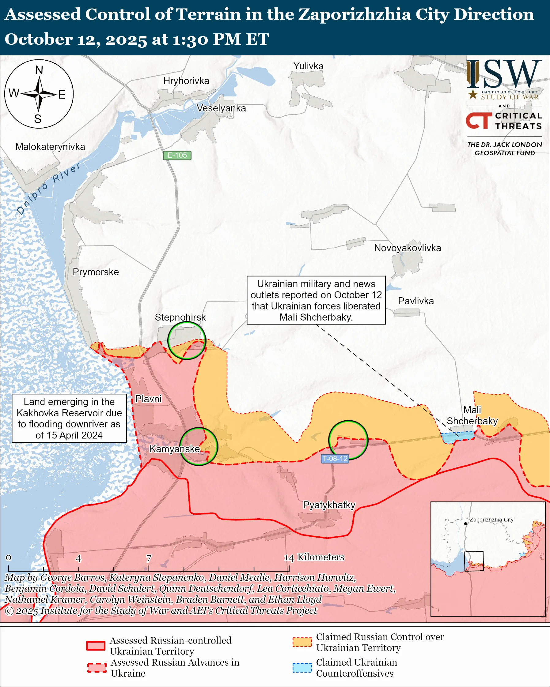 - Украинские войска недавно продвинулись на западе Запорожской области. Батальон, который действует в этом районе, и представитель Сил обороны Юга Владислав Волошин сообщили, что украинские подразделения освободили населенный пункт Малые Щербаки, расположенный к юго-западу от Орехова. Геолокационные кадры, опубликованные 12 октября, показывают украинских военных, которые поднимают флаги в этом населенном пункте.