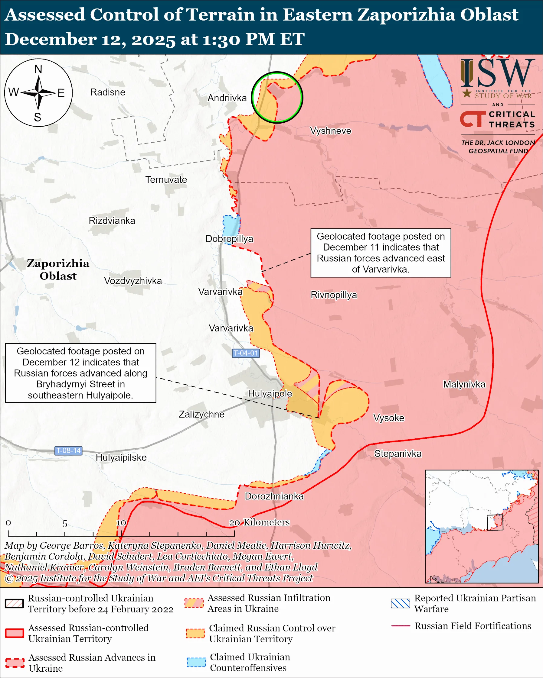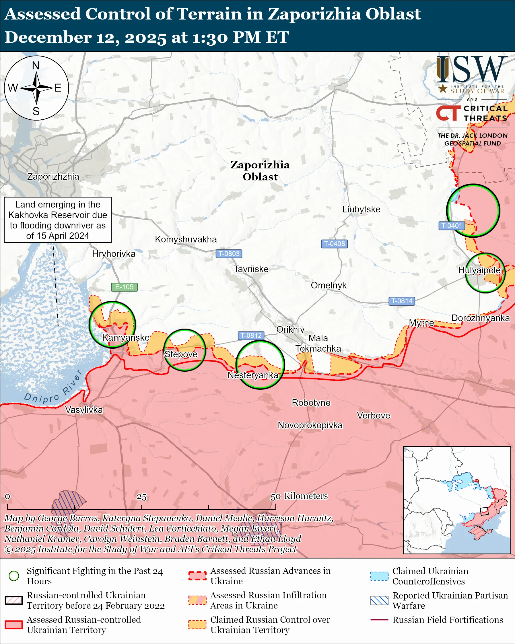 - 12 декабря российские войска продолжили наступательные операции на западе Запорожской области, но не продвинулись вперед. Россияне атаковали на юго-восток от Орехова вблизи Малой Токмачки и на запад от Орехова вблизи Новоандреевки, Степного, Степногорска и Приморского.