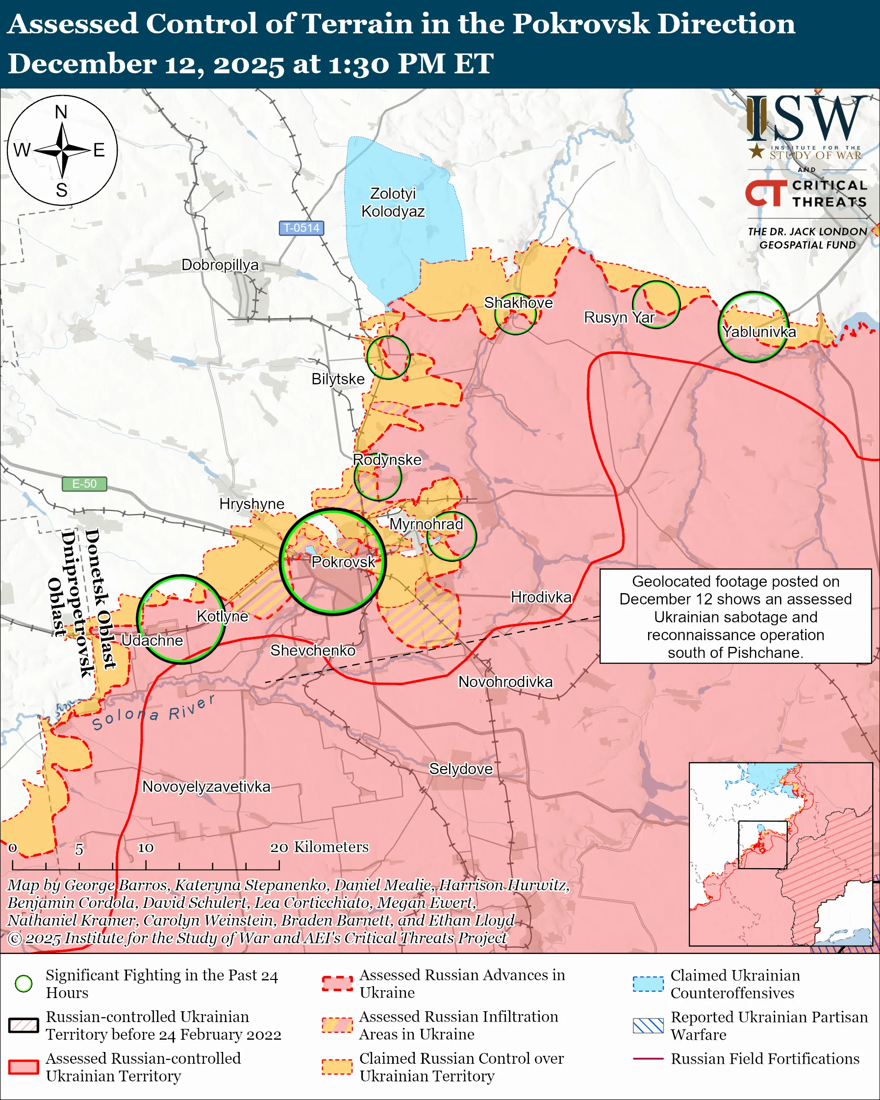 - Российская армия продолжила наступательные операции на Покровском направлении, но не продвинулась вперед. Геолокационные кадры, опубликованные 12 декабря, показывают, что российские силы действуют в северном Покровске.