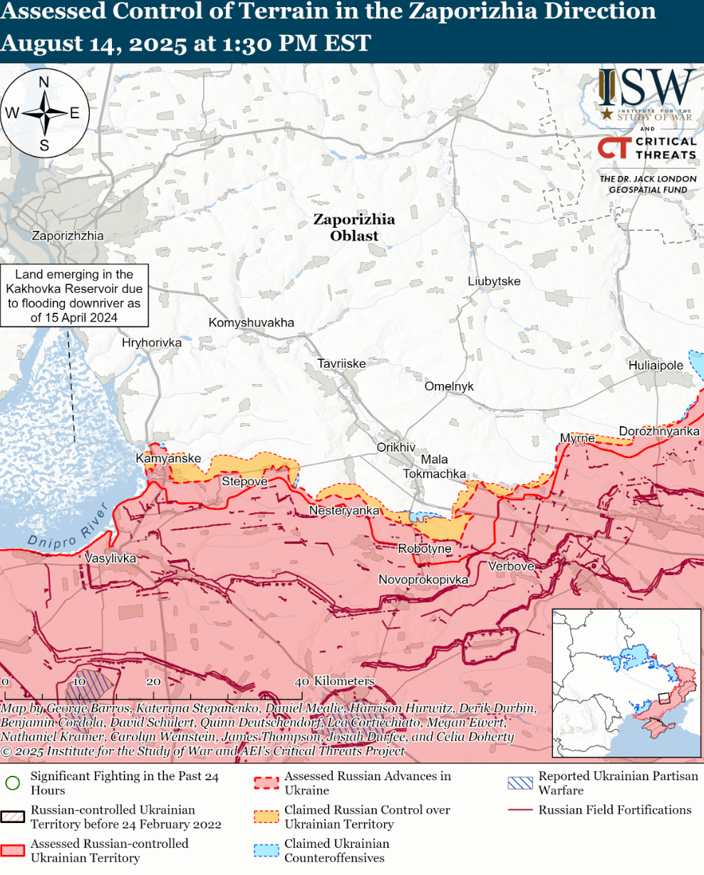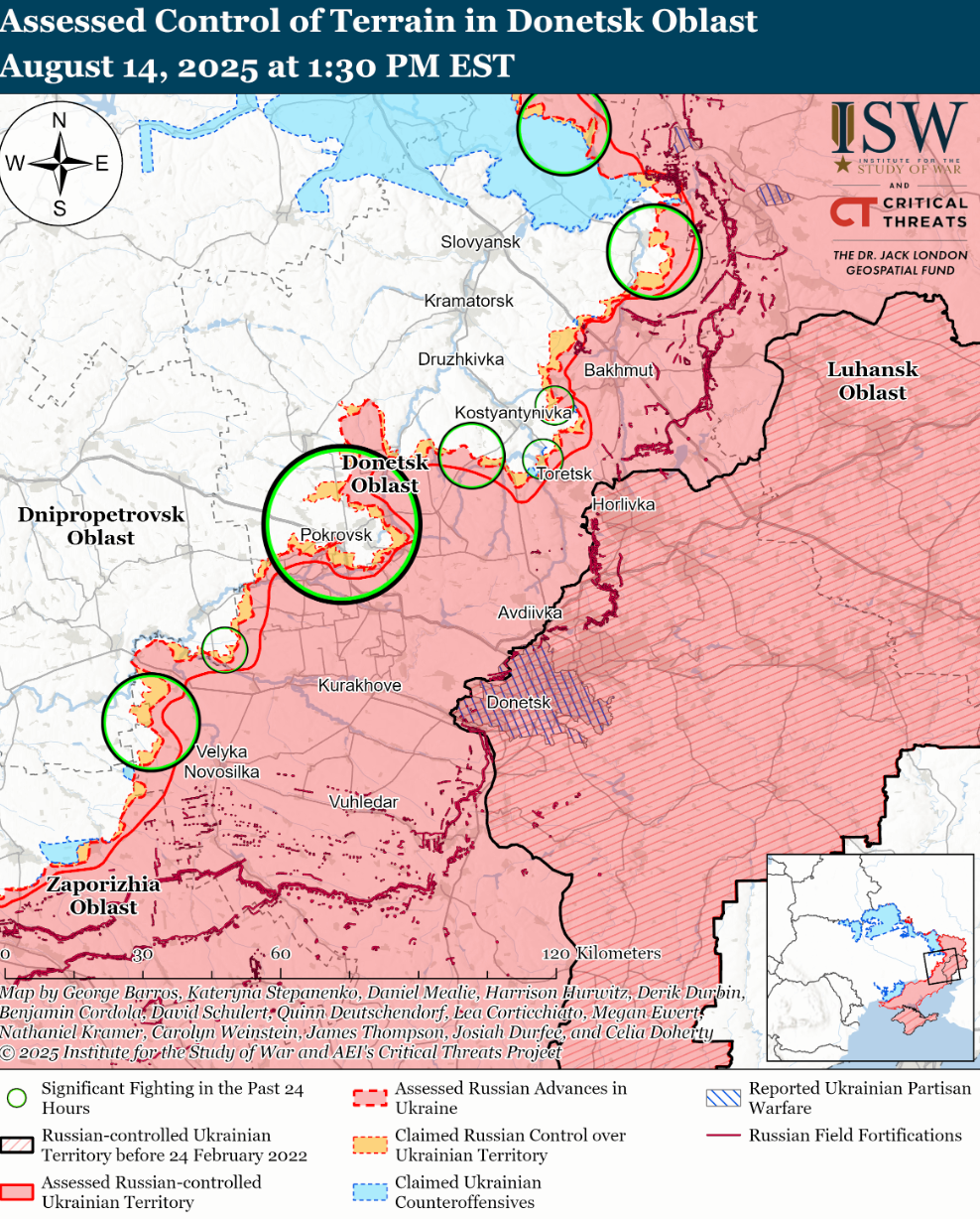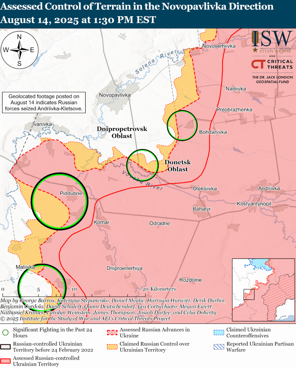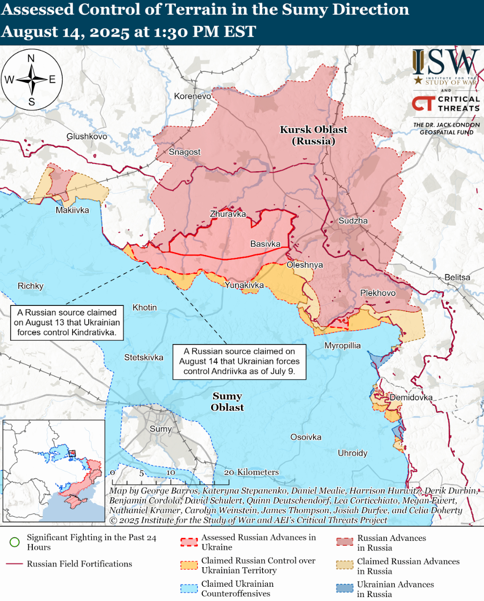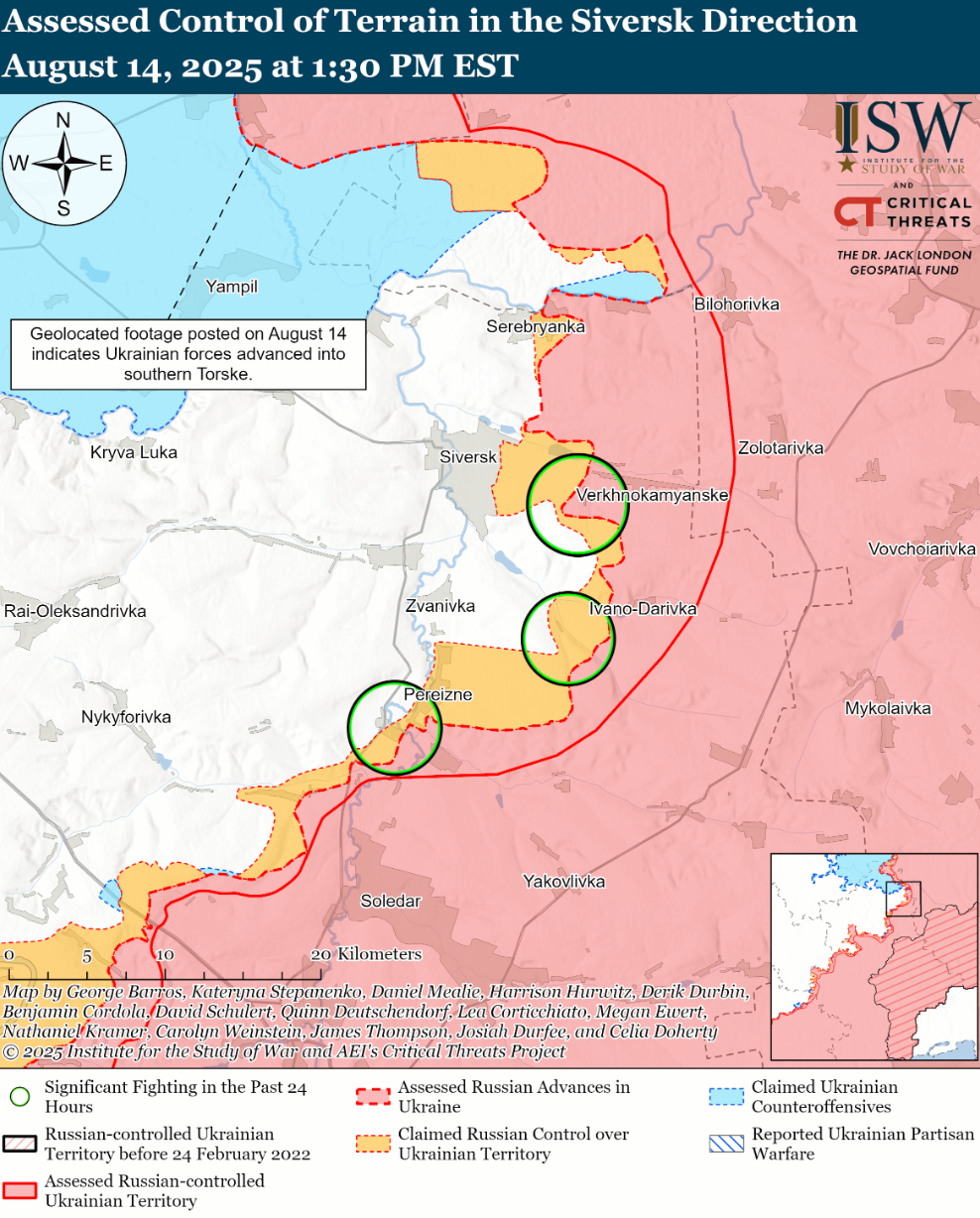- Ни украинские, ни российские источники не сообщали о наземной активности в направлении Великого Бурлука 14 августа.
