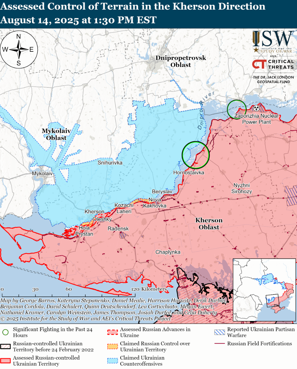 - Российские оккупанты продолжали ограниченные наступательные действия на Херсонском направлении 13 и 14 августа, но не продвигались вперед.
