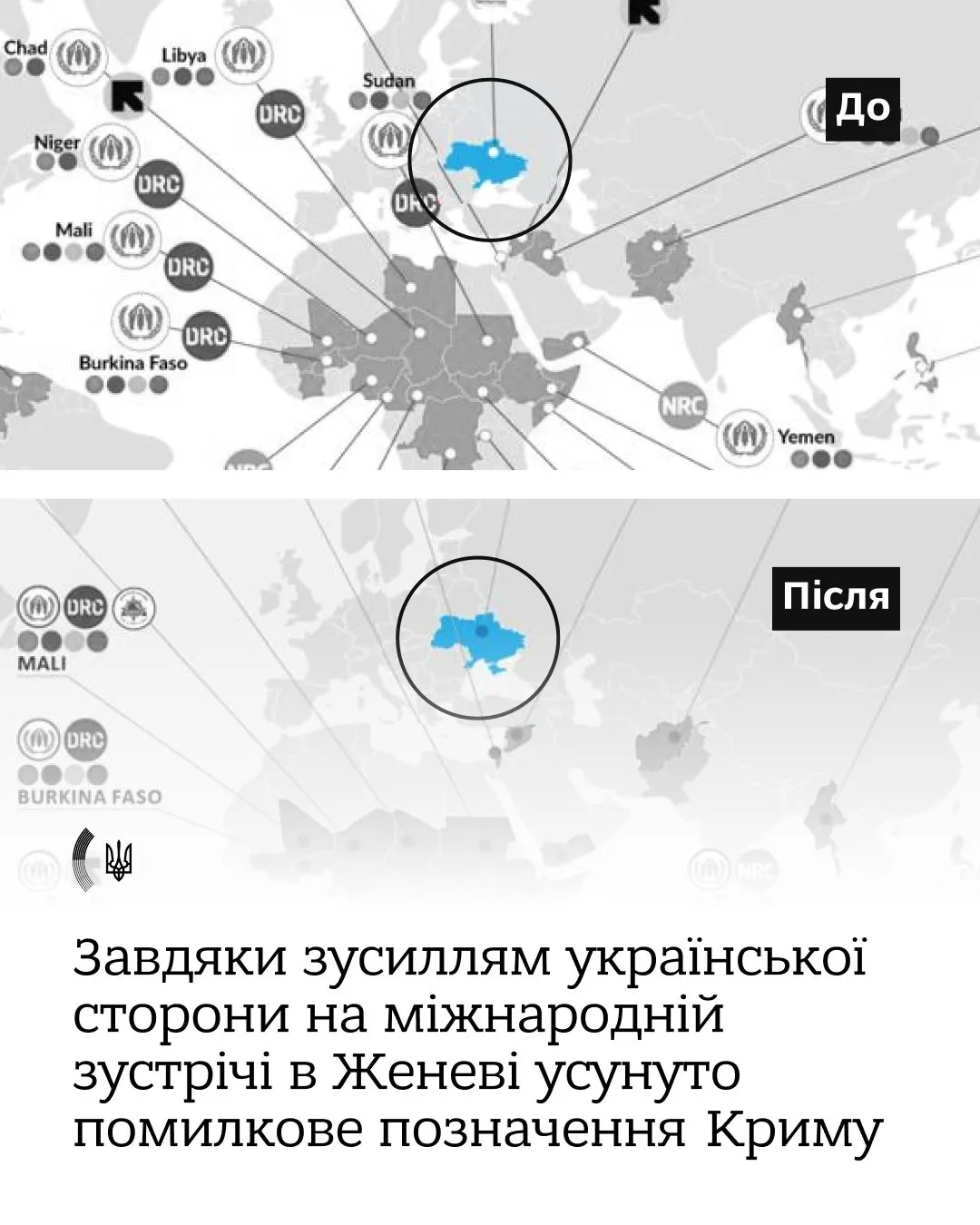 Во время дополнительного мероприятия в рамках 28-й Международной встречи национальных директоров по вопросам противоминной деятельности и советников ООН в Женеве украинская делегация заметила некорректное изображение территории Украины – временно оккупированный Крым был обозначен как часть России.