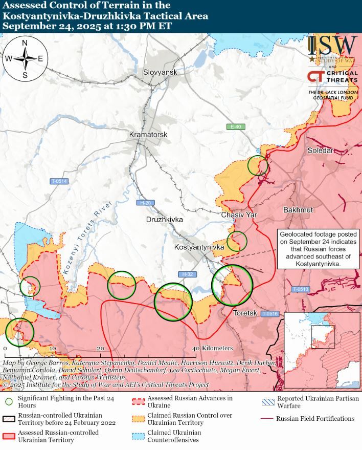 Российские войска недавно продвинулись в тактическом районе Константиновка – Дружковка. Геолокационные видеозаписи, опубликованные 24 сентября, свидетельствуют о том, что российские войска недавно продвинулись к восточной окраине Константиновки. Российские войска наступали на северо-восток от Константиновки возле Часова Яра и Орехово-Васильевки; на восток от Константиновки возле Александро-Шультино; на юго-восток от Константиновки возле Катериновки, Клебан-Бык, Щербиновки, Плещеевки; на юг от Константиновки возле Александро-Калинового и Иванополья; на юго-запад от Константиновки возле Яблоновки; на юг от Дружковки возле Русиного Яра и Полтавки; и на юго-запад от Дружковки возле Софиевки и Владимировки 23 и 24 сентября.
