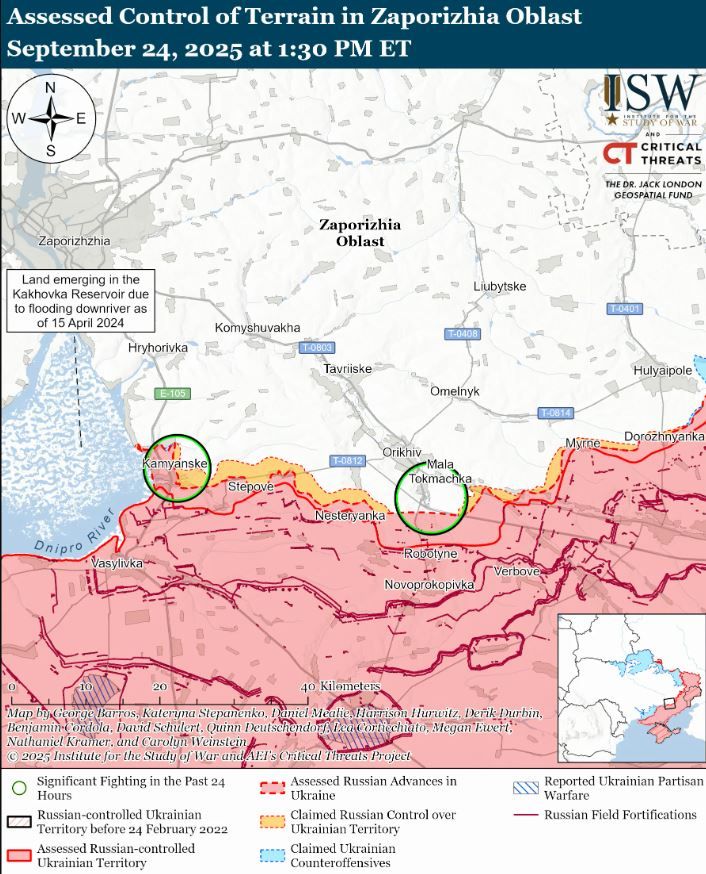 Впрочем, есть продвижение россиян на западе Запорожской области. Геолокационные видеозаписи, опубликованные 23 сентября, свидетельствуют о том, что российские войска недавно продвинулись на юго-запад Степногорска (к западу от Орехово). 23 и 24 сентября российские войска атаковали на юго-восток от Орехова вблизи Малой Токмачки и на запад от Орехово вблизи Каменского и Приморского.