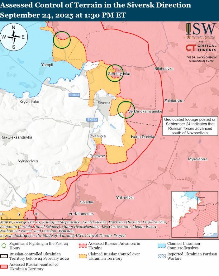 Российские войска недавно продвинулись на Северском направлении. Геолокационные видеозаписи, опубликованы 24 сентября, свидетельствуют о том, что российские войска недавно продвинулись на юг от Новоселовки (к востоку от Северска). 23 и 24 сентября российские войска атаковали на северо-запад от Северска вблизи Дроновки; на северо-восток от Северска вблизи Серебрянки; на юго-восток от Северска вблизи Выемки; и на юго-запад от Северска вблизи Переездного.