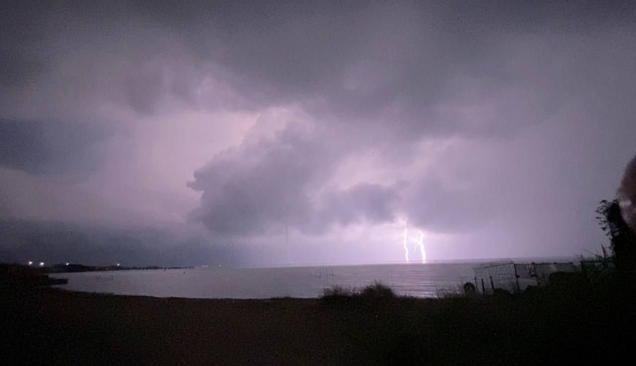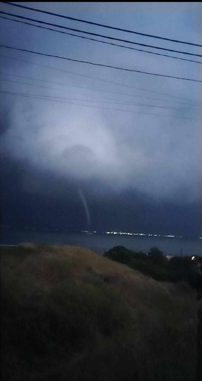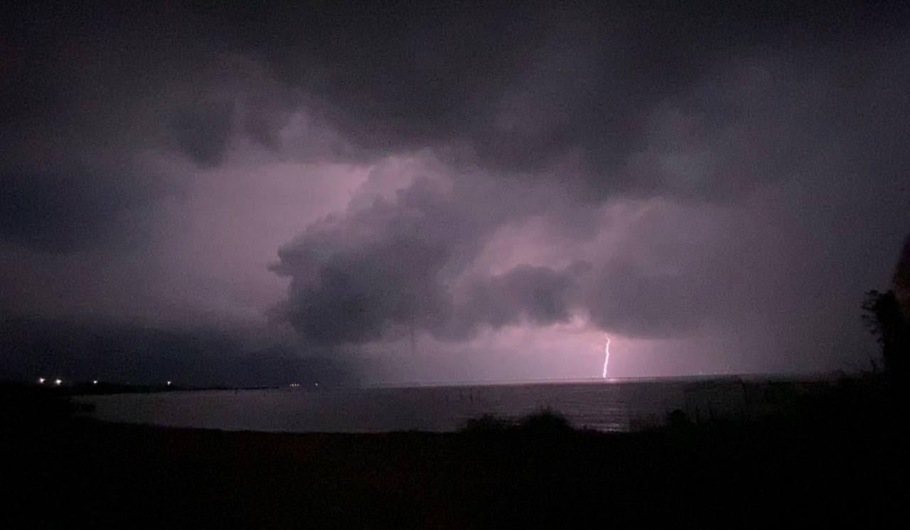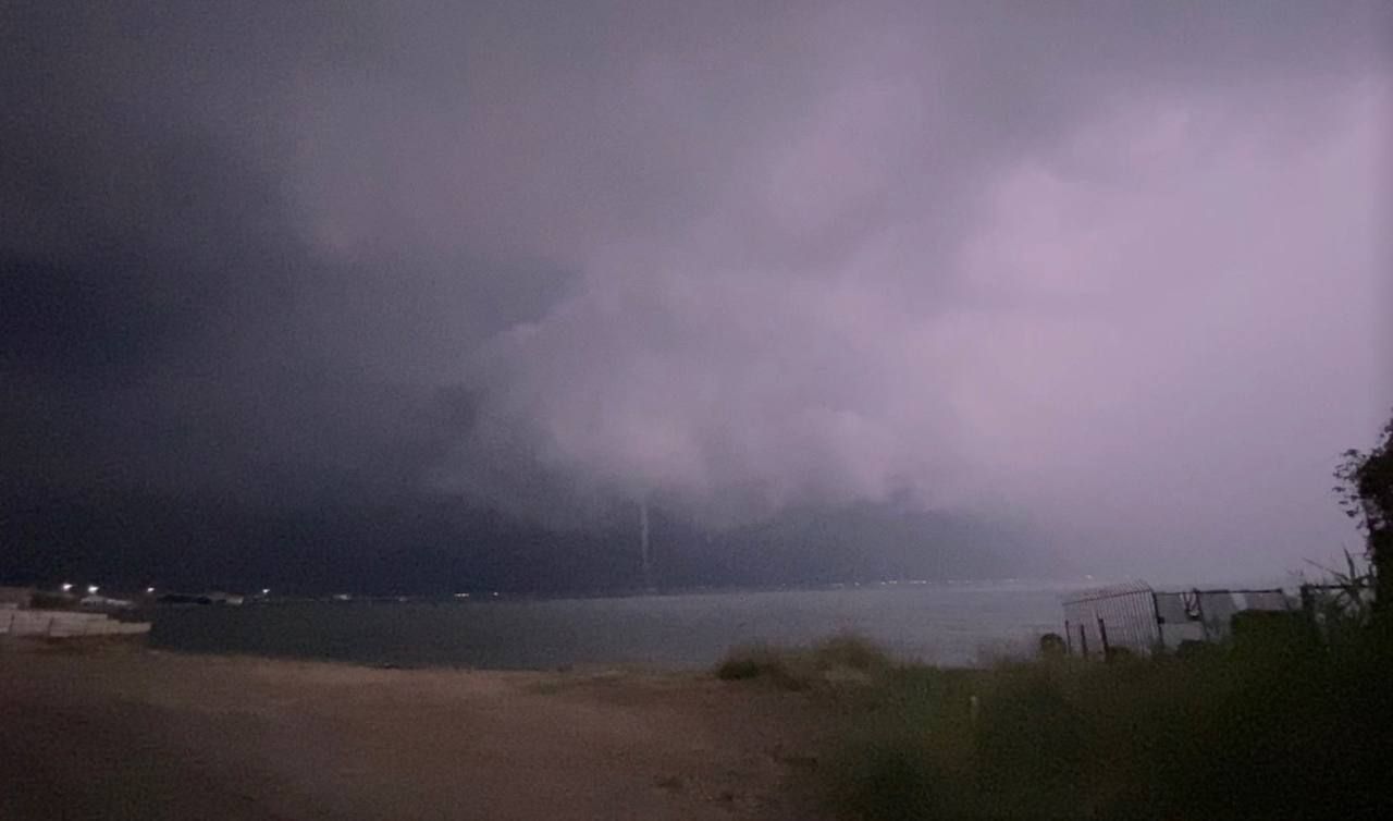 На фото, опубликованных в сети, видно, как мощная молния подсвечивает небо над морем. В то же время рядом с ней заметен вихрь от смерча. На некоторых кадрах удалось одновременно поймать и смерч, и молнию.