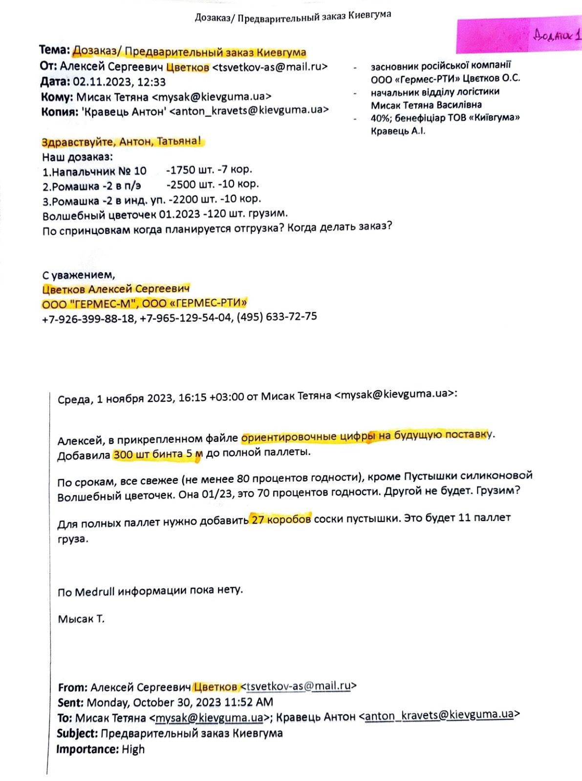 Так, несмотря на все заявления о патриотизме и честном бизнесе от руководства компании, достаточно подтверждений работы на Россию уже после начала большой войны. Это и инвойсы, и переписка напрямую с клиентами в России, и слова благодарности от самих оккупантов. Много интересной информации обнаружили и в компьютере гендиректора "Киевгумы" Андрея Острогруда.