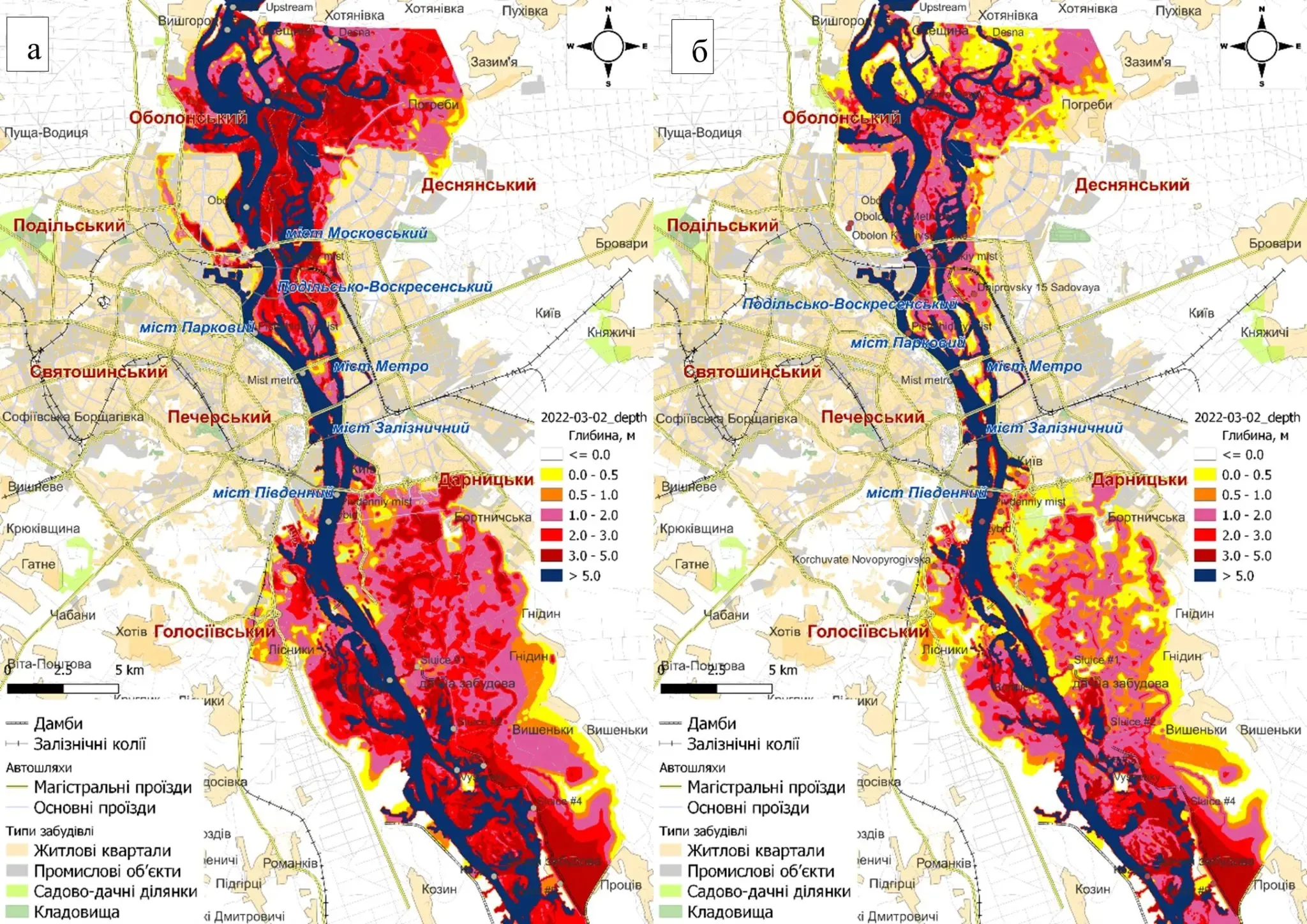 Возможные затопления в результате прорыва шириной 280 метров (слева) и 100 метров (справа) / Инфографика НАН