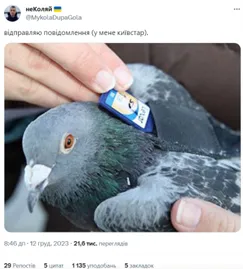 Пока официальной информации о возобновлении работы сети Киевстар нет, пользователи соцсетей не теряют энергии и придумали способ отправки сообщений. Абонентам Киевстара предлагают воспользоваться голубиной почтой.