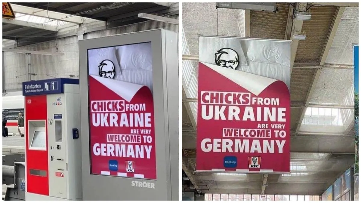 Незадолго до заседания в сети начали появляться фотографии билбордов, установленных на вокзале Мюнхена в Германии. Это вроде бы была реклама KFC. На них был изображен основатель сети полковник Сандерс, который лежит в постели с откинутым одеялом. Изображение дополняла провокационная надпись: "Цыпам из Украины очень рады в Германии".