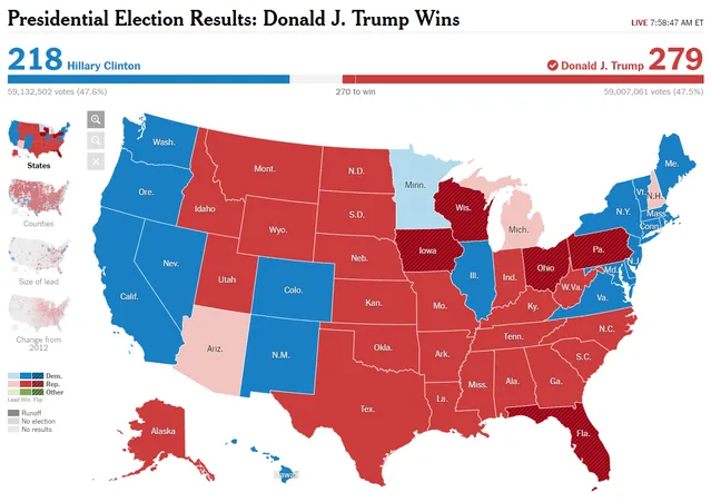Трамп набрал 279 голосов выборщиков при необходимых 270, а Клинтон – 218 голосов.