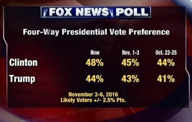 Телеканал Fox News провел опрос общественного мнения, который показал, что Клинтон все еще на 4 пункта опережает Трампа по популярности среди американских избирателей.