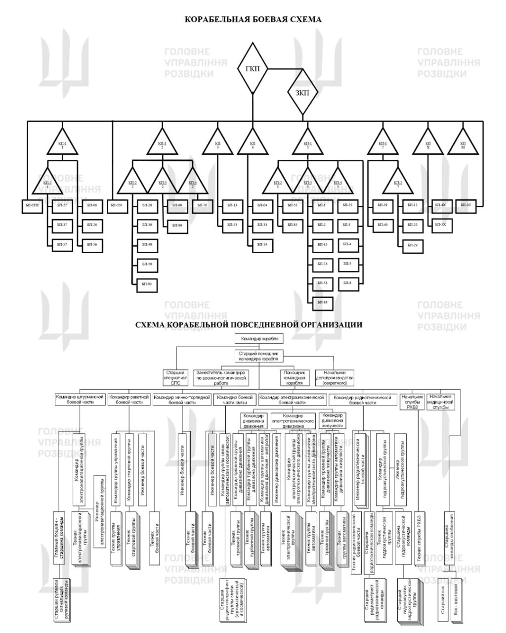 - боевая схема корабля, схемы систем обеспечения живучести и организационной структуры экипажа;