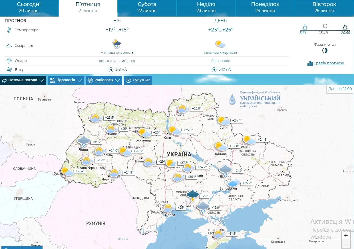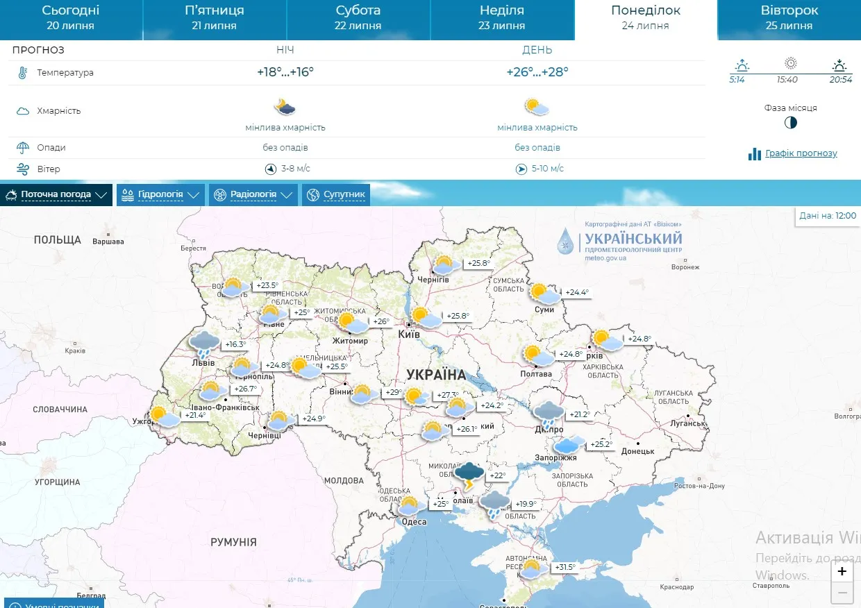 - 24 июля погодные условия в Украине определят антициклон. Однако он быстро сместится на Восток и уже с 25 по 27 июля очередные атмосферные фронты приведут к дождливой погоде в большинстве областей.
