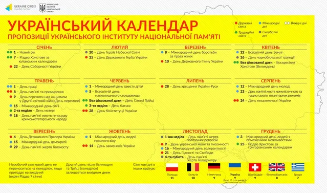 Он добавил, что украинцы не поддержали намерение ввести Шевченковский день (9 марта) и День семьи (вторая пятница сентября) как выходные праздничные, поэтому это предложение сняли с календаря.