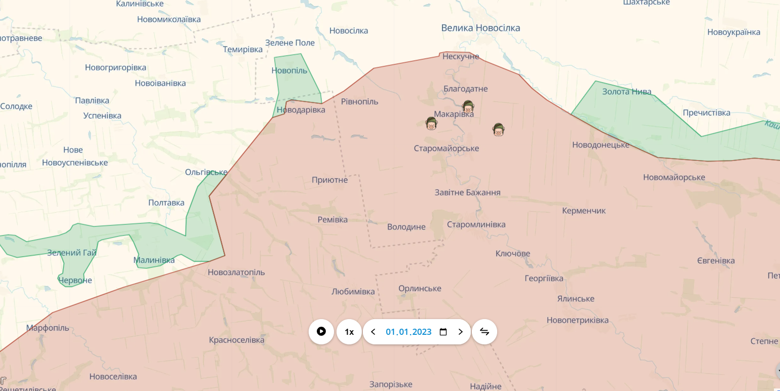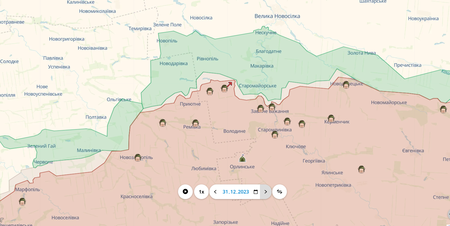 В конце 2023 года россияне так же стремились вернуть себе утраченные здесь позиции. Для этого враг атакует Старомайорское с запада.