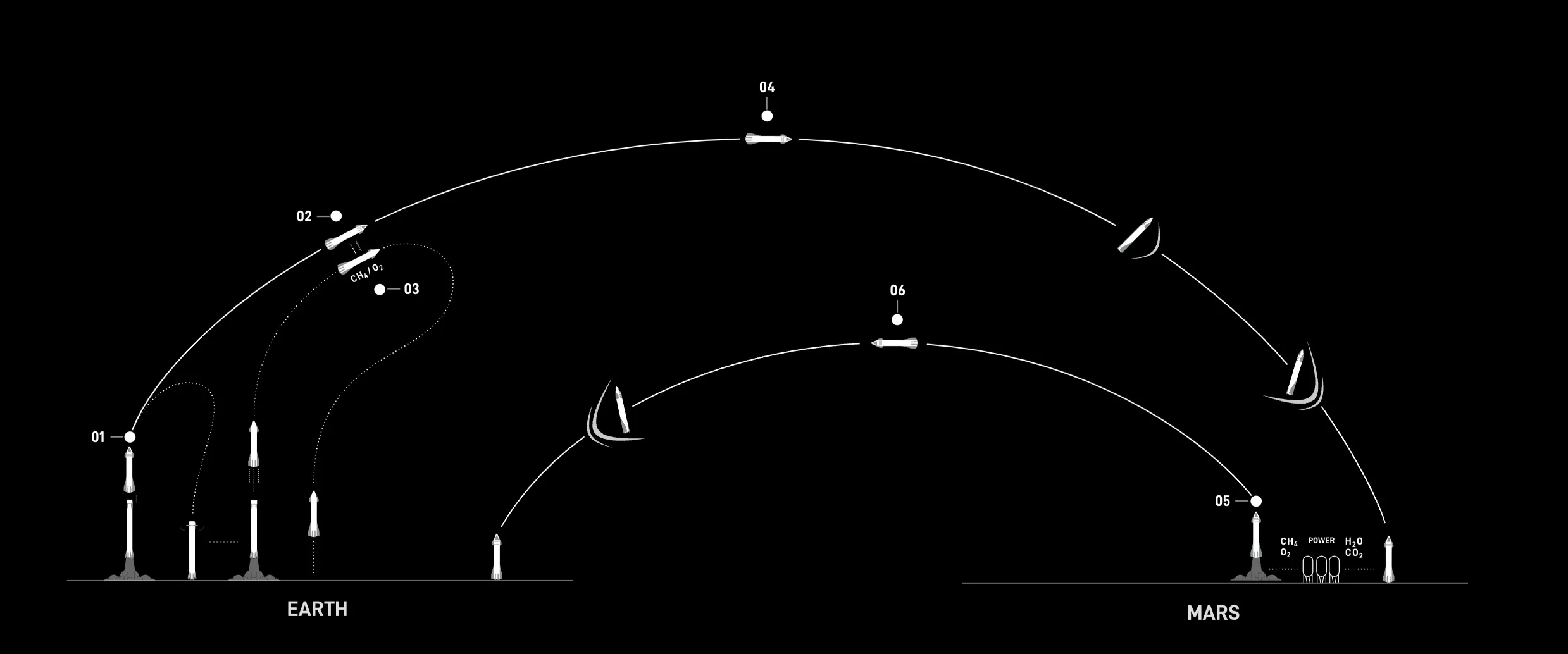 Характеристики Starship, которую компания хочет использовать для заселения Марса, позволяют осуществлять дозаправку на орбите и использовать природные ресурсы H2O и CO2 Марса для дозаправки на поверхности планеты.