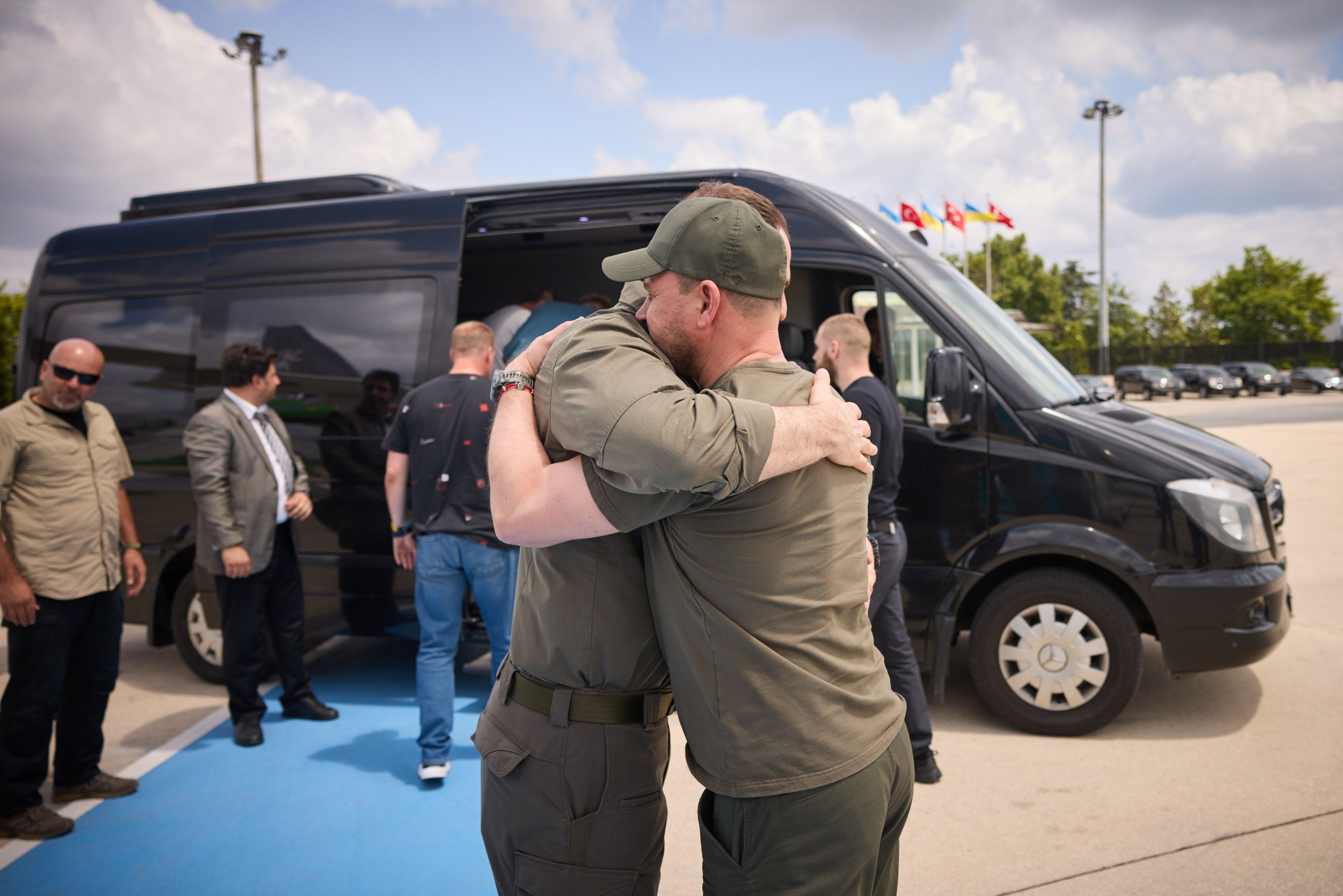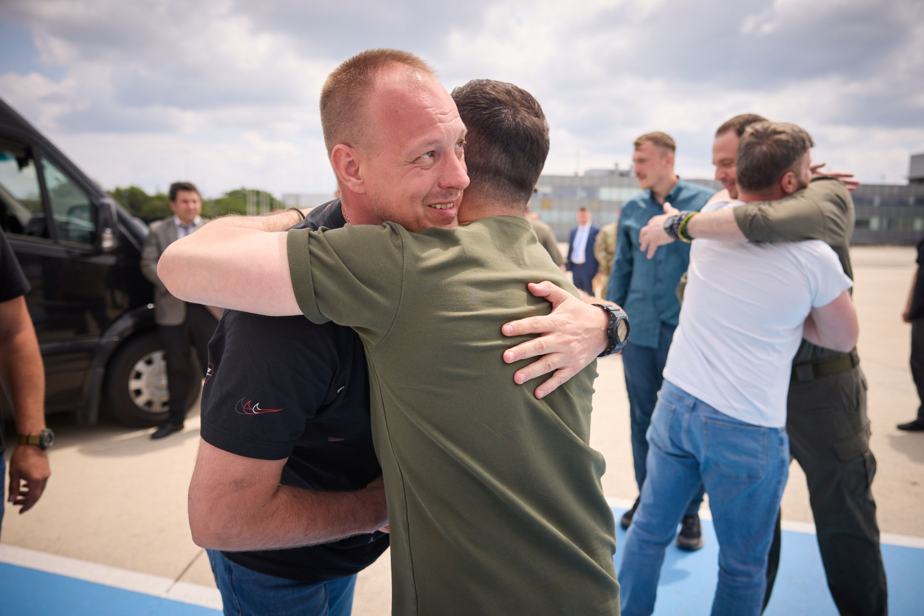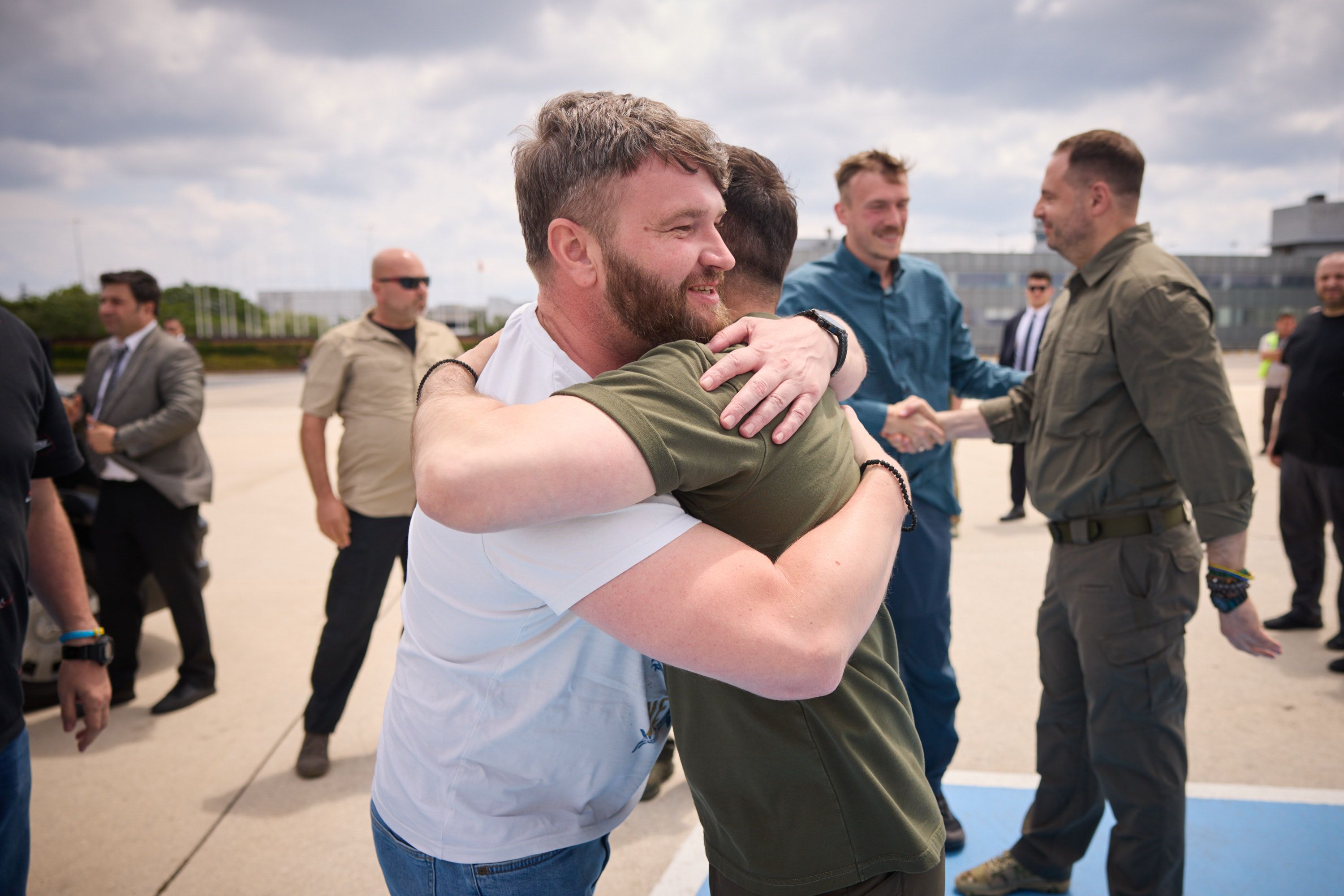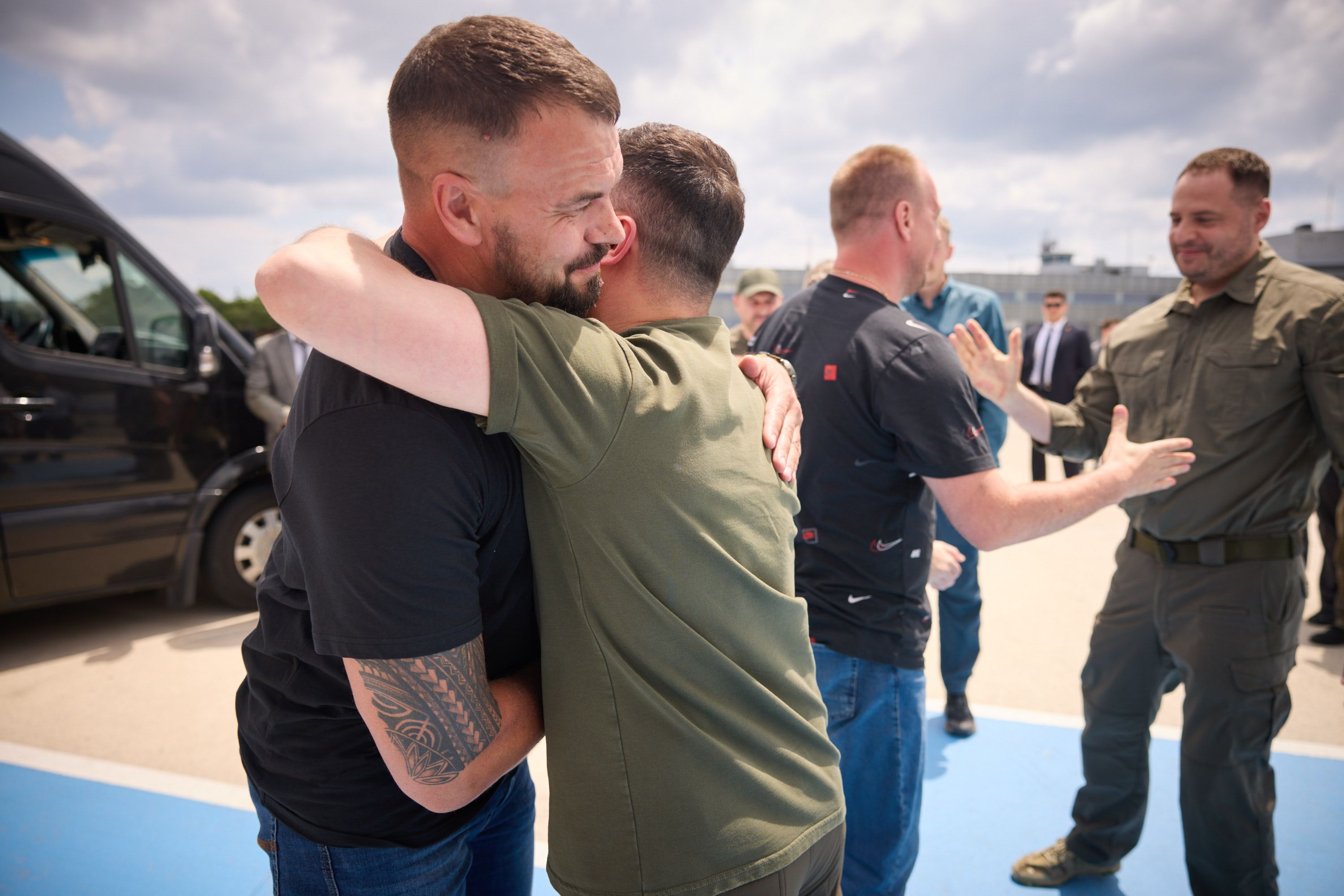 Впоследствии опубликовали кадры, на которых видно, как Владимир Зеленский, глава Офиса Президента Андрей Ермак и глава МВД Игорь Клименко встречают защитников на аэродроме. Оттуда они сели на самолет, чтобы отправиться домой.