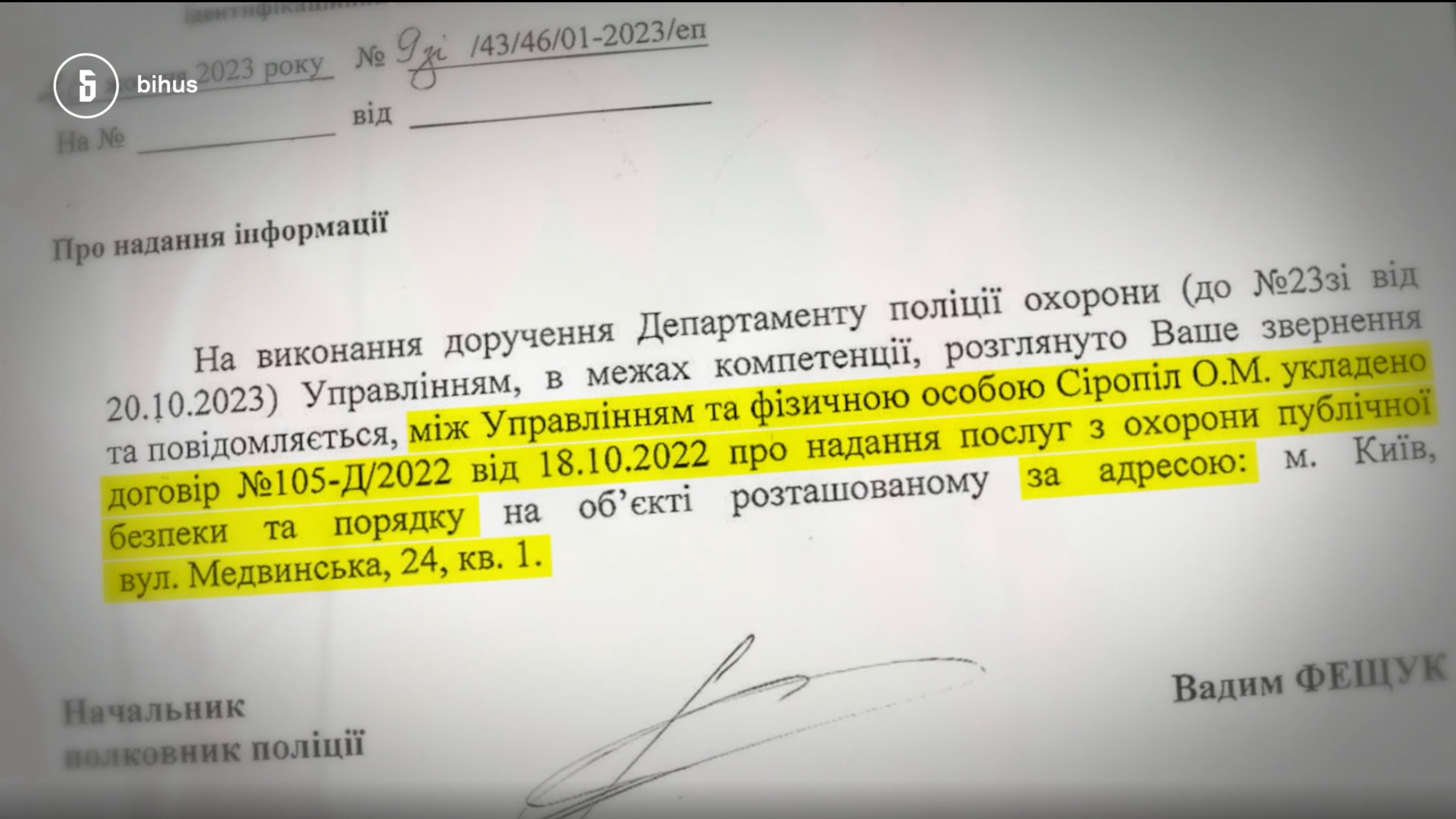Журналистка узнала в Управлении полиции охраны по физической безопасности в Киеве., нанявшую полицию охраны в имение физическое лицо Сиропил А. М. По данным редакции, говорится, вероятно, об Александре Николаевиче Сирополе, который является завхозом Медведчука из его личного поместья.