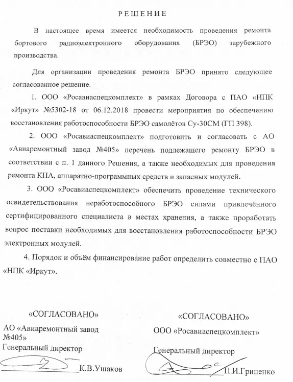 В конце 2018 года в ПАО "Иркут", по информации из внутренней записки, возникают проблемы с техническим обслуживанием и ремонтом радиоэлектронного оборудования иностранного производства, установленного на самолетах Су-30СМ.