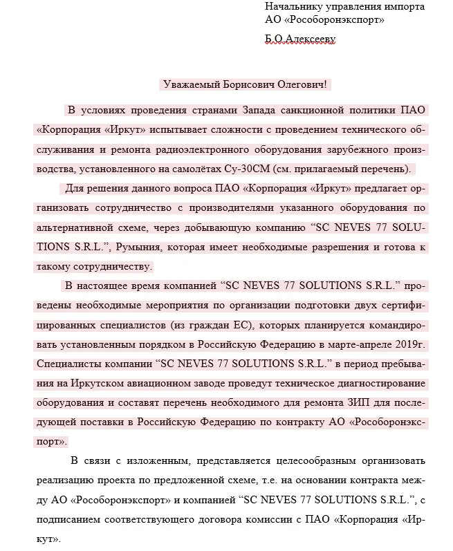 В декабре 2018 года российская компания "Росавиаспецкомплект" подписала договор с "Иркутом" для поставки оборудования, которое производят французские компании THALES и SAFRAN. Однако тогда уже действовали международные санкции, запрещавшие поставки такой продукции. Чтобы обойти эти ограничения, "Иркут" предложил использовать румынскую компанию SC NEVES 77 SOLUTIONS S.R.L., которая уже имела опыт в подобных схемах обхода санкций.