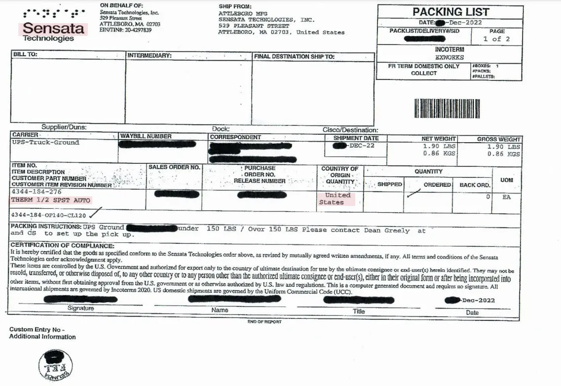 Во внутренней переписке российской компании "Росавиаспецкомплект" были обнаружены доказательства закупки оборудования американского производства от Sensata Technologies. Эти закупки осуществлялись в интересах российской компании "НьюТекноСервис", а предметом поставок были термостаты. По словам Анатолия Храпчинского, заместителя директора компании-производителя РЭБ и бывшего офицера Воздушных сил, термостаты выполняют функцию контроля температурного режима во многих авиасистемах самолетов, например на бортовых радарах, электронике и двигателях.
